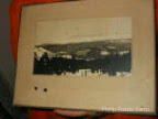 Photograph with mat of Mt. Hood for a far distance. Picture in black and white. In winter with rolling hills and tree covered in snow.