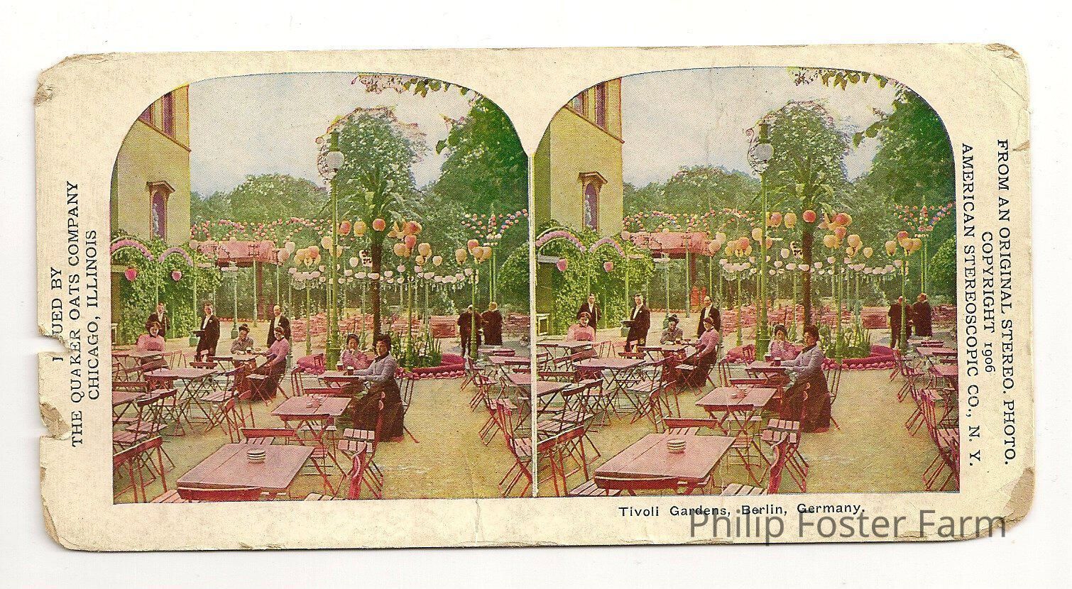 Picture of outdoor tables, chairs with a few people seated. On right side:"From an original stereo photo, copyright 1906, American stereoscopic co., N.Y.". On left side: "___ued by the Quaker Oats Company, Chicago, Illinois". Back has listing of stereoscopic images available. Colored.Collection