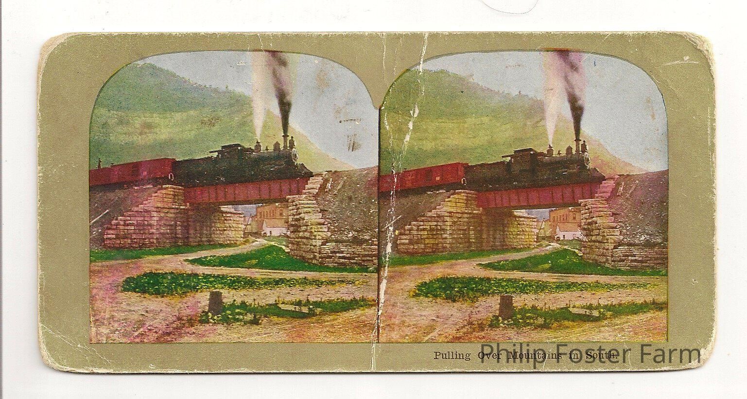 Pictured a steam locomotive crossing bridge. Colored.