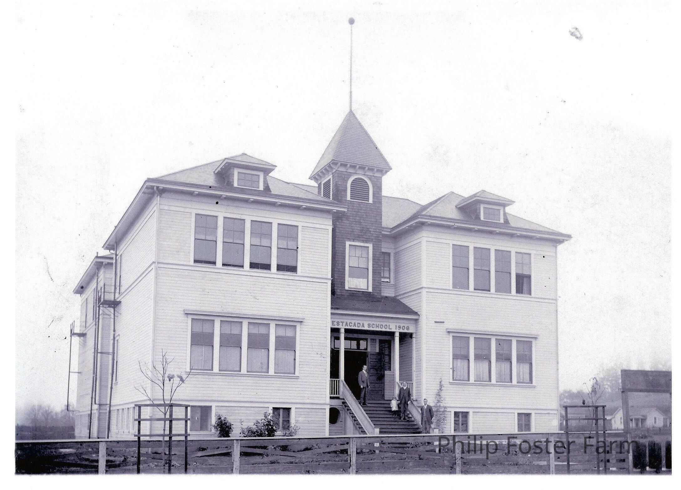 Old Estacada Grade School and High School. Built in 1908. Three men standing at various levels on stairs. Center man holding hand of small child.Collection