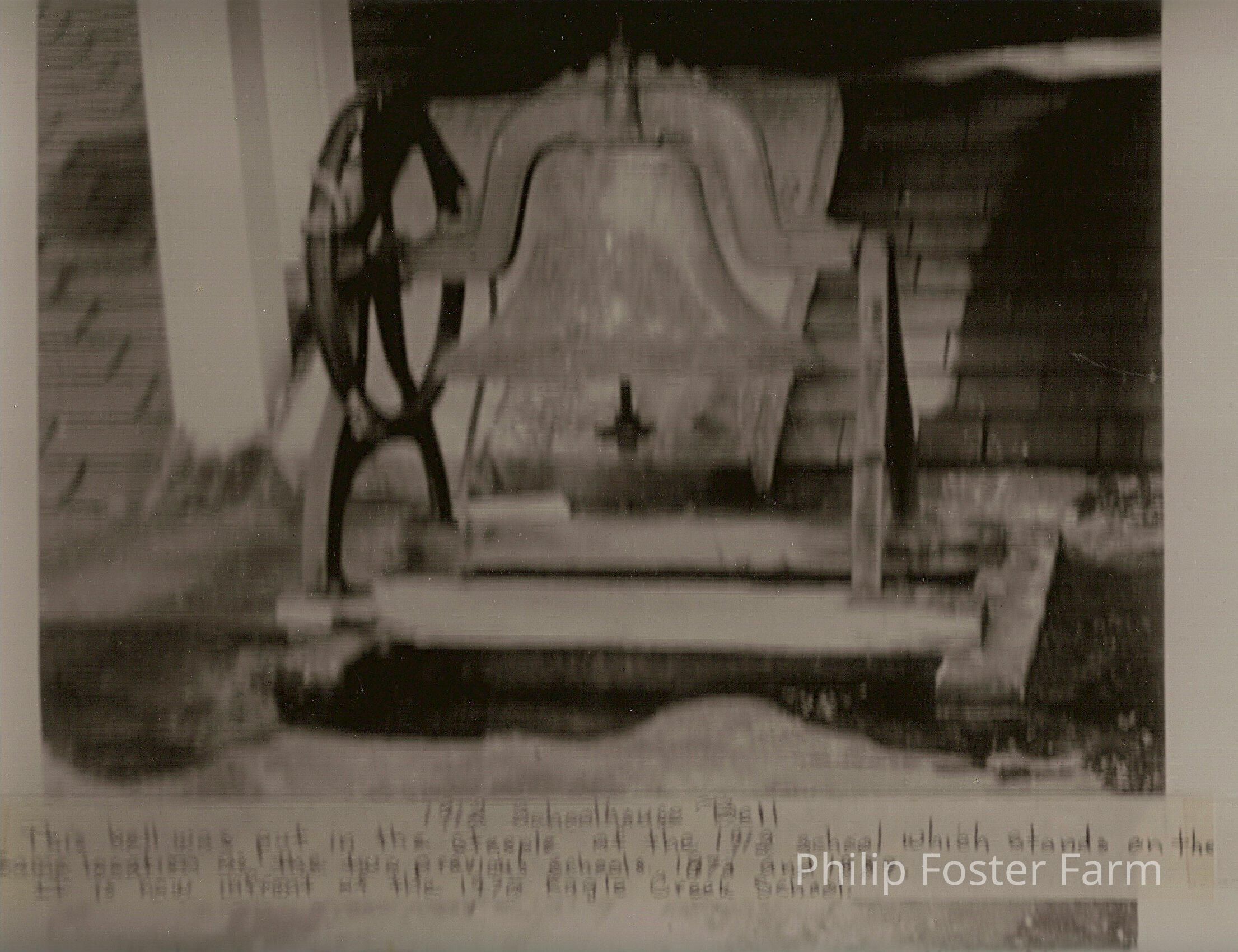 Photograph of a schoolhouse bell, COPY. Photographer Jim Stephan. Caption reads: 1912 Schoolhouse Bell. This bell was put in the steeple of the 1912 school which stands on the same location as the two previous schools, 1873 and 1889. It is now infront of the 1970 Eagle Creek School.