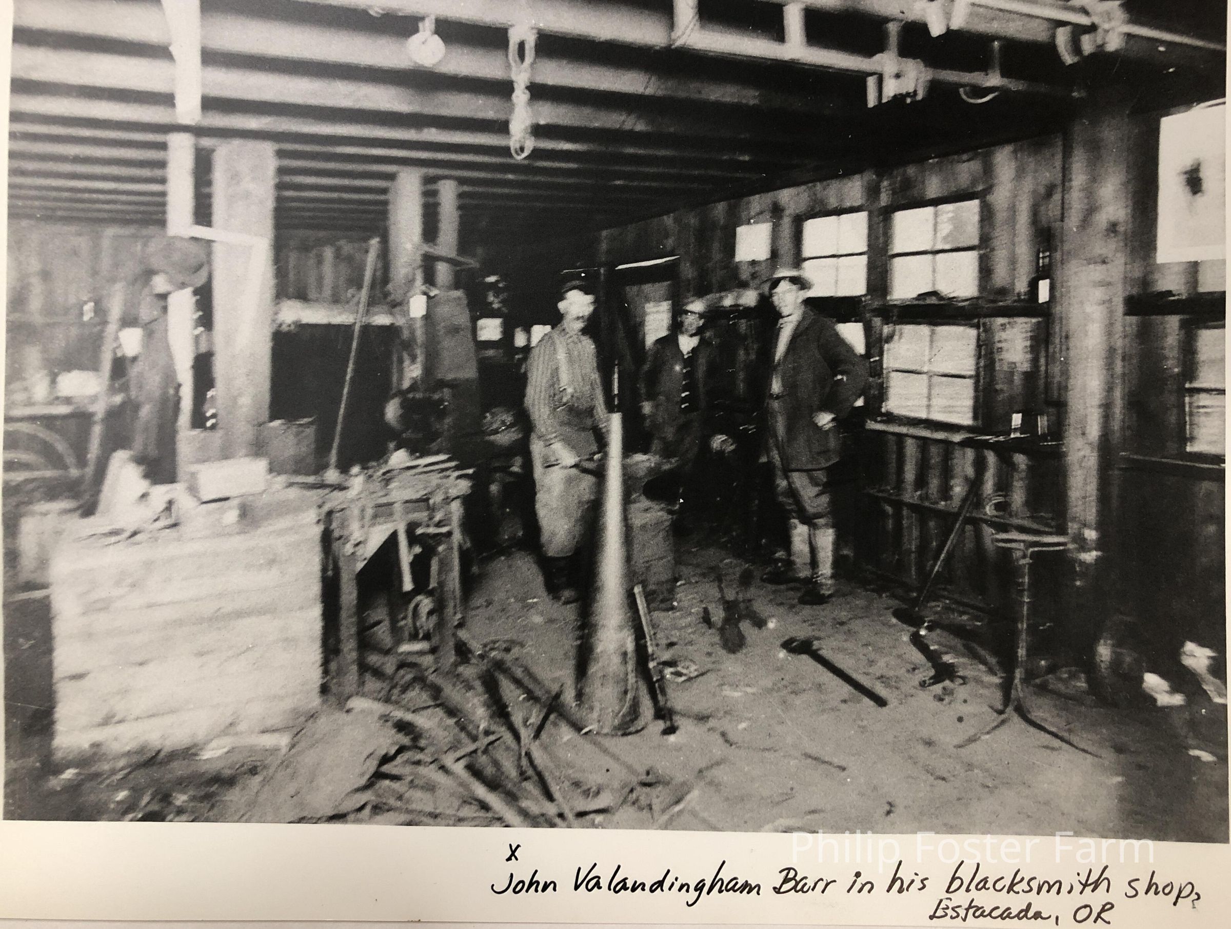 8" x 10" black and white photo of the interior of the blacksmith shop. John V. Barr (father) and 2 other men inside the shop. Possibly the man on the right is Sam.Collection