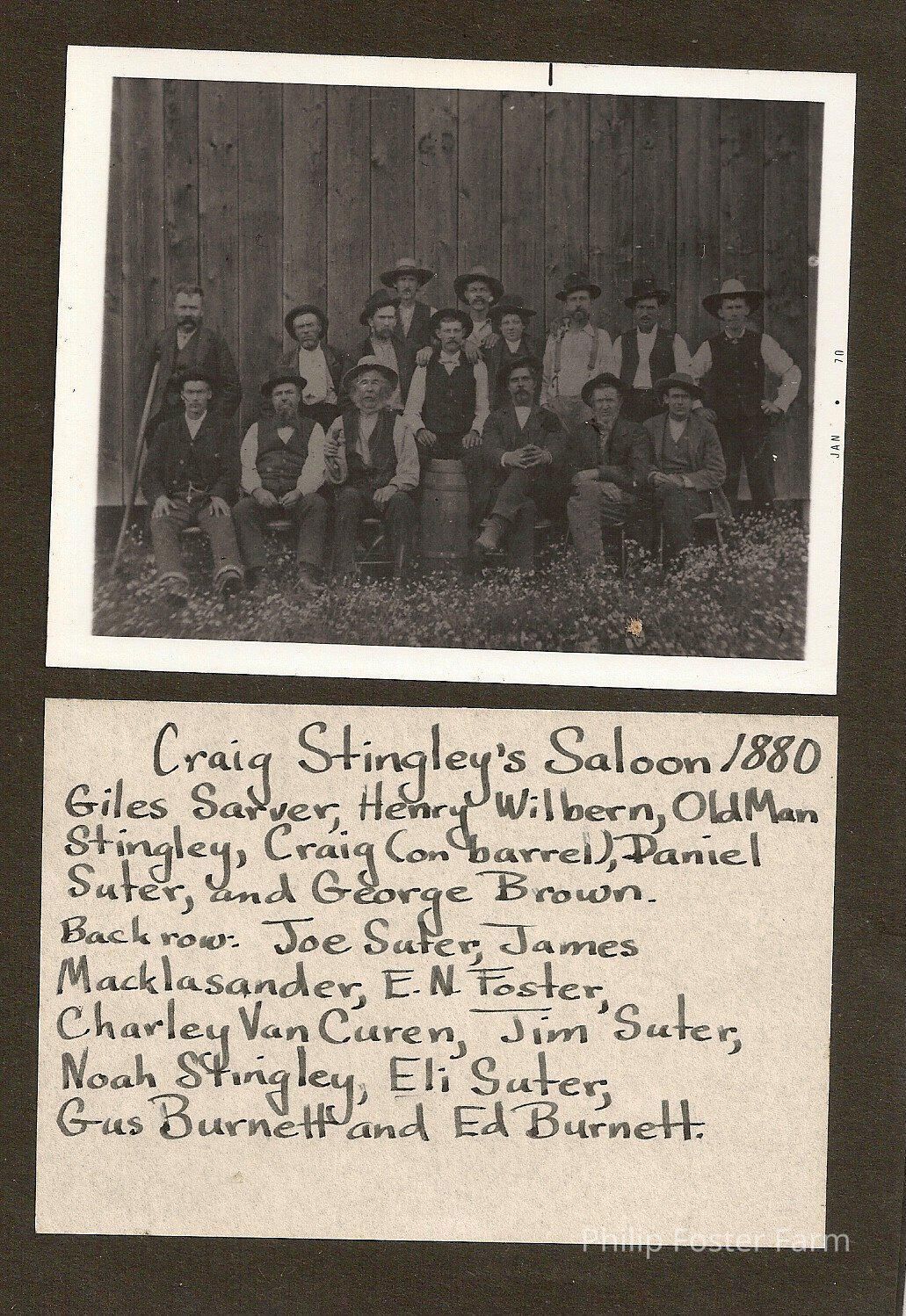 COPY of 1880 photograph with labeling below. Craig Stingley's Saloon 1880. Giles Sarver, Henry Wilbern, Old Man Stingley, Craig (on barrel), Daniel Suter, George Brown, Joe Suter, James Macklasander, E.N. Foster, Charley VanCuren, Jim Suter, Noah Stingley, Eli Suter, Gus Burnett and Ed Burnett.Collection