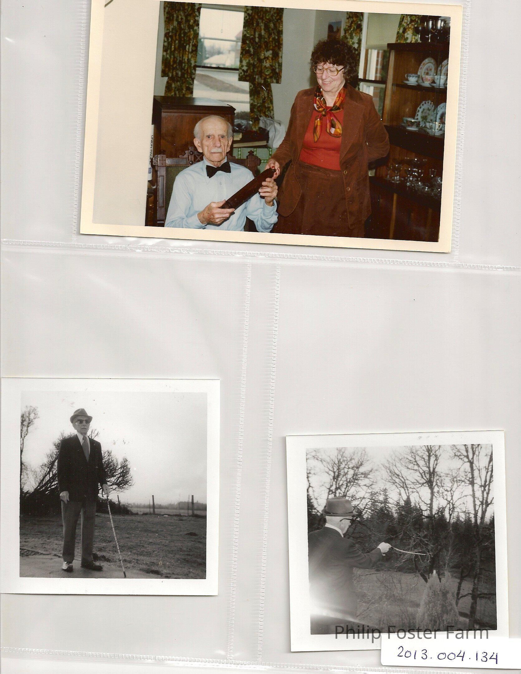 Photographs of E. L. (Roy) Meyers. 1. Roy Meyers and Betty Cody 1976 2. Roy pointing to location of Grist Mill 1975 3. Roy Meyers 1975 Lilac tree