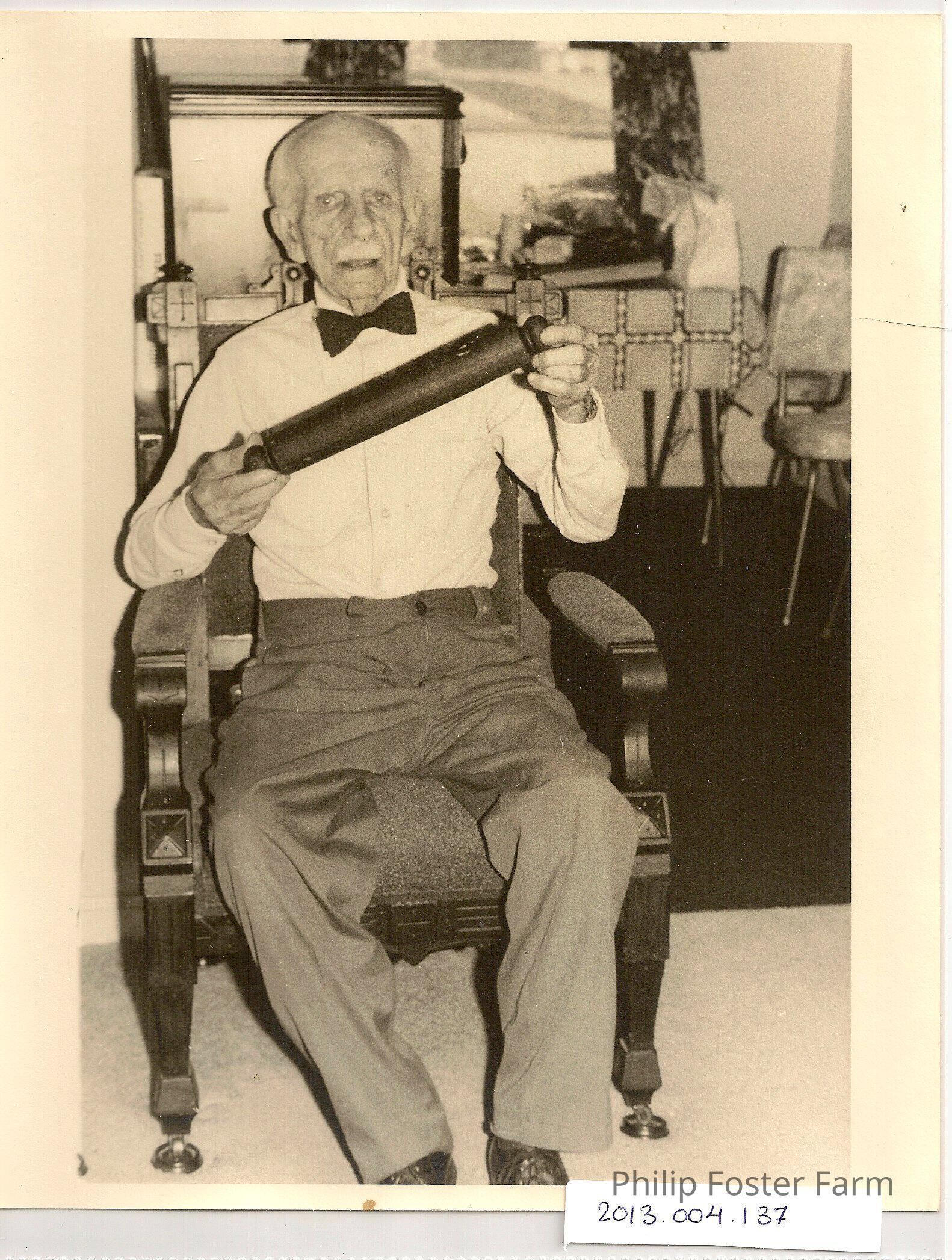Large version of photograph: E. L. (Roy) Meyers holding rose wood rolling pin. For smaller but better-quality and color version, see item 2013.004.135.