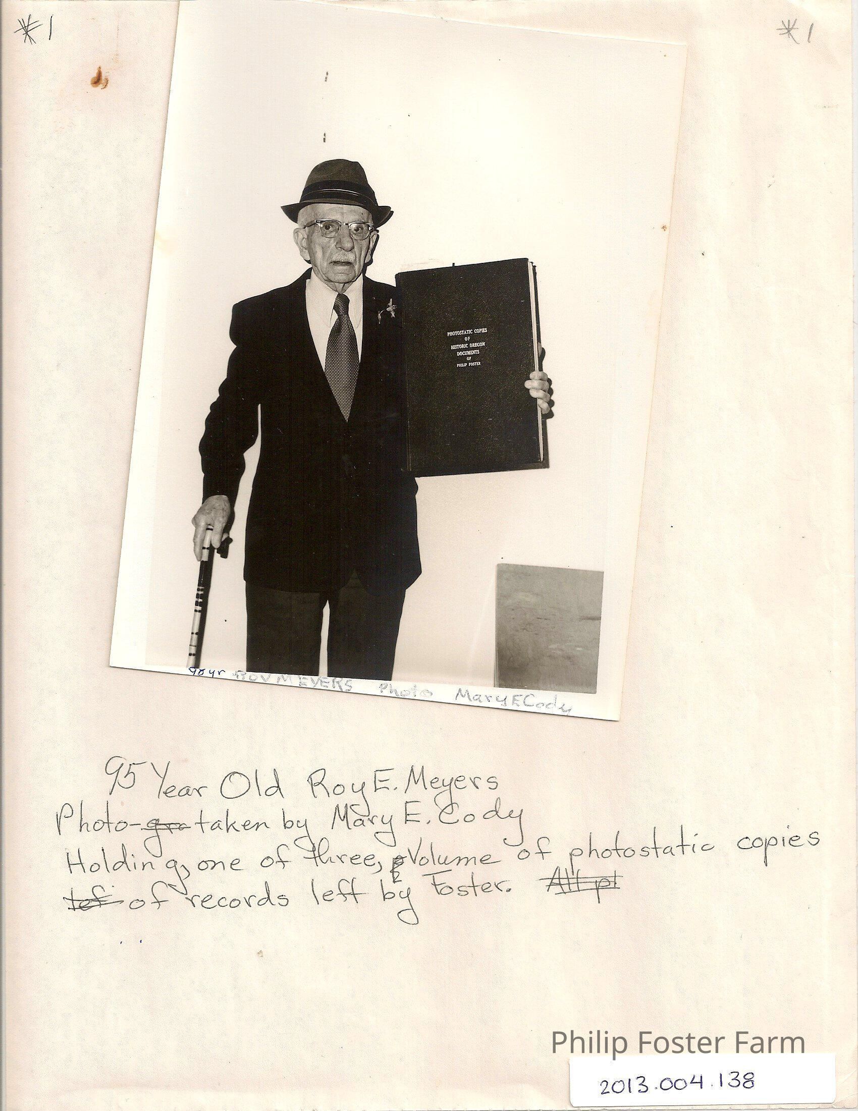 "95 Year Old Roy E. Meyers (E. L. "Roy" Meyers). Photo taken by Mary E. Cody. Holding on of three volumes of photostatic copies of records left by Foster."