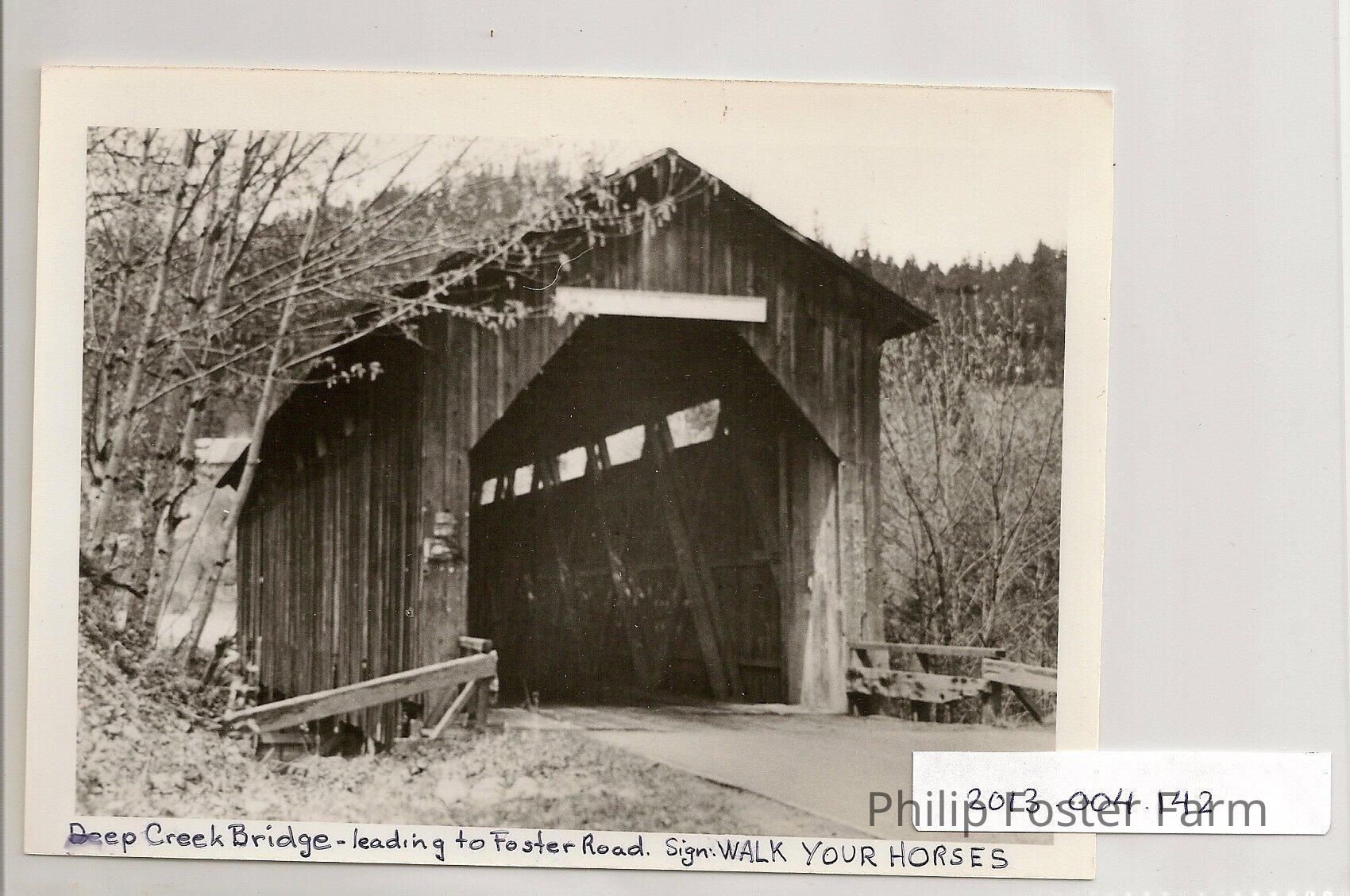 COPY (enlarged) of 1929 photograph of the covered bridge over Deep Creek. Leads to Foster Road. Sign "Walk Your Horses."