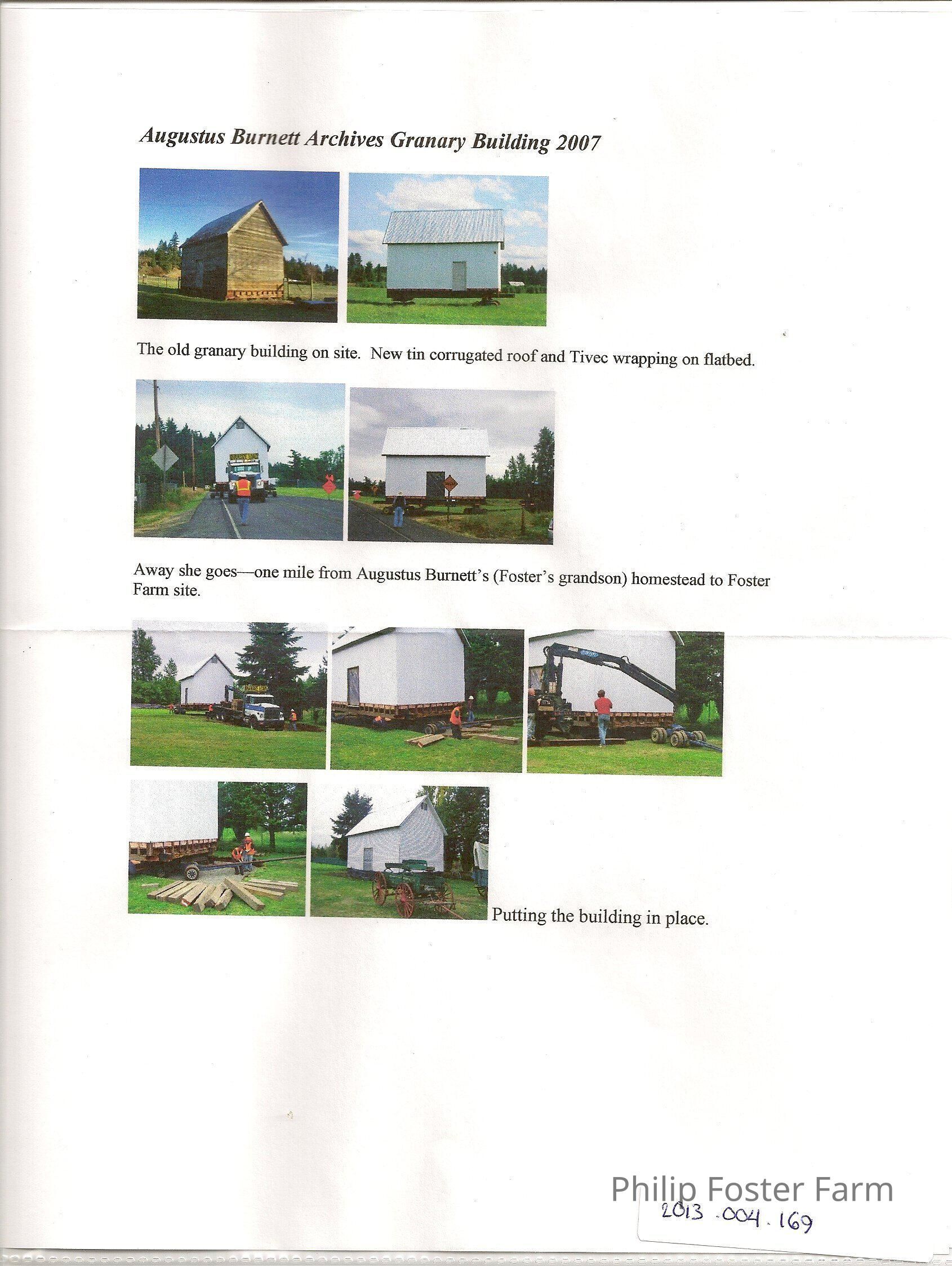 Small, printed, digital photogaphs of: Augustus Burnett Archives Granary Building being moved in 2007. Historic photos labeled "ETown Walk"