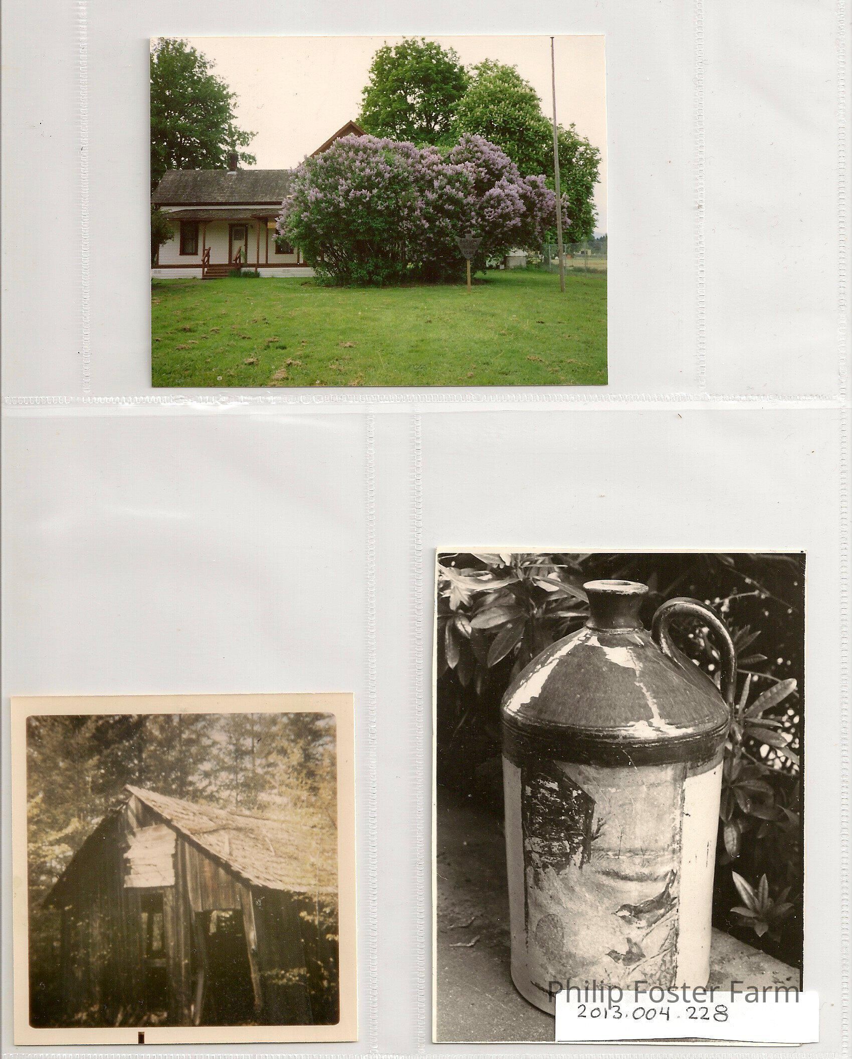 Photographs: 1. A run-down wood shed in a forest, no description 2. A clay jug with a scene painted on it 3. Foster Farm house, suspected around 1990