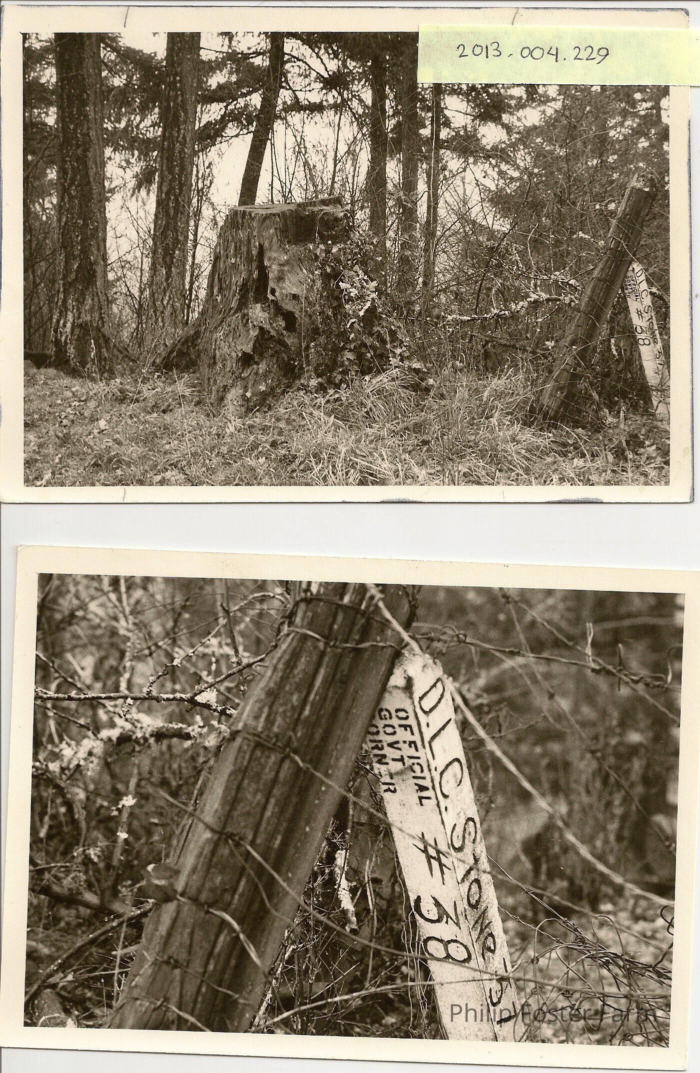 Two photographs of tree: "8 [inch] tree with P Foster blaze [from] 1843. Tree cut down 1970 - stone with x near."