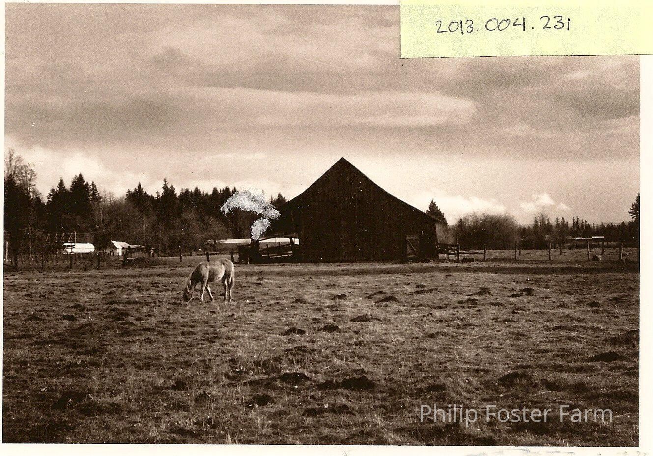 Photograph of Philip Foster Farm Barn with horse in foreground.