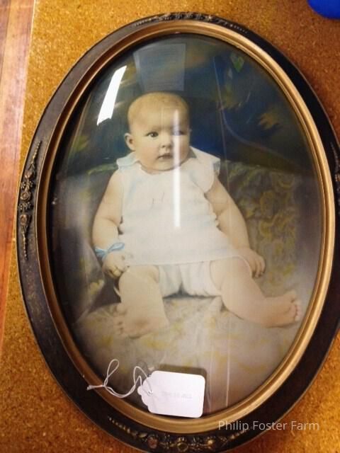 Large "bubble" framed oval photograph of sitting baby in white. Blue bow tied around right wrist.