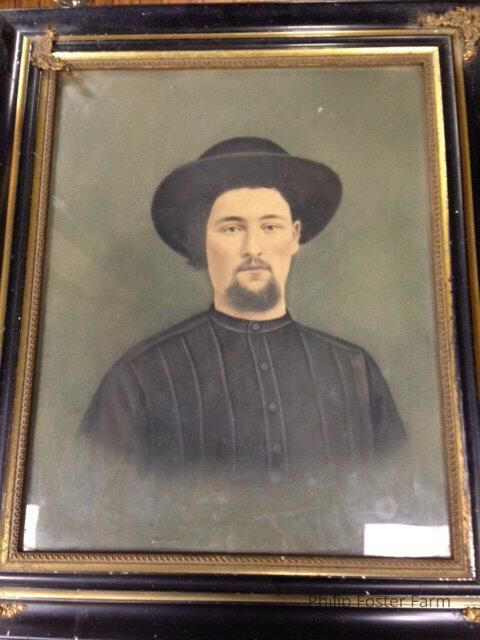 Large "hand-coloured" photograph of David Huggins (Rose Westermann's father) dressed in black shirt and hat. Black and gold frame.