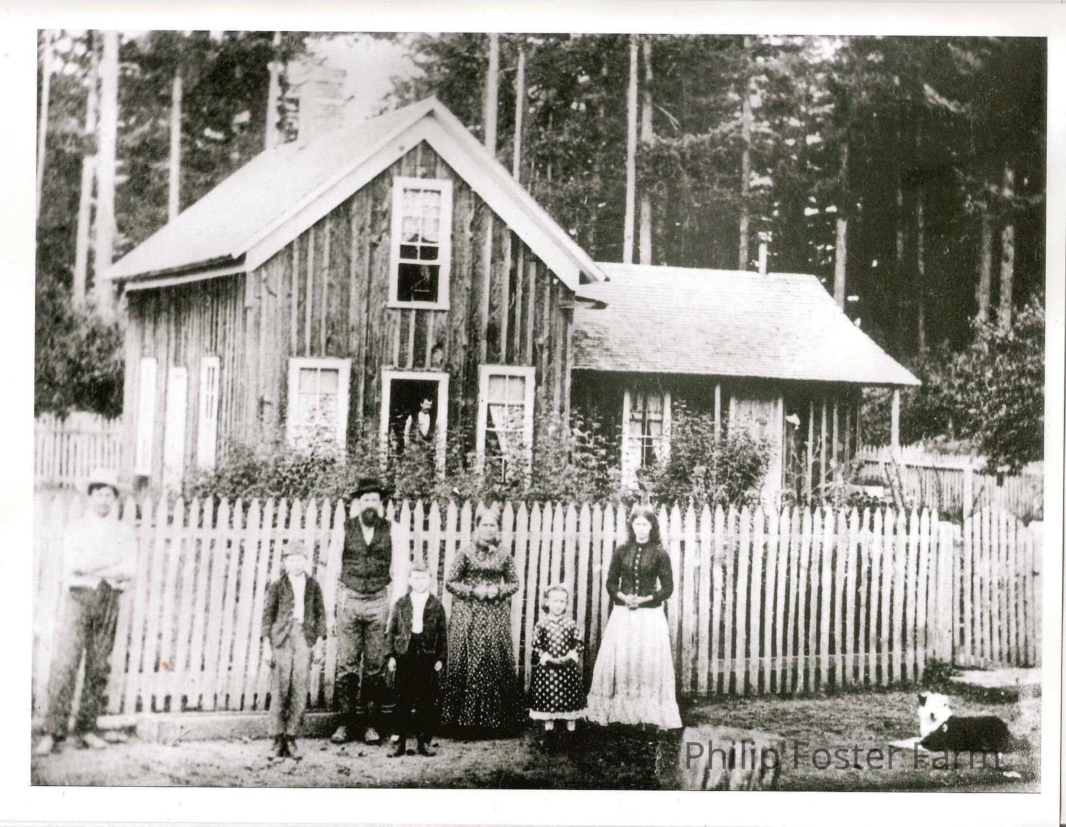 Typed description glued to back of photocopy: "This photo is of the Shankland family that where [were] long time residents of Currinsville area. The house behind the white picket fence is their original home and the house remains there to this day, although remodeled many times over since as shown of board and batten construction. The construction date of this house is estimated at 1870. The date of this photo could be determined by census records and the marriage date of Henry Palmateer and Clara Shankland. Henry Palmateer is standing in the house doorway and Clara is standing on [the] far right side of photo. The family as standing left to right is: Elmer, Theodore, William H. (father), Andrew, Nancy "Linn" (mother), Effie, and Clara. The first post office for the Currisville [Currinsville] area was located in one bedroom of this home. Circa for this photo is about 1900."