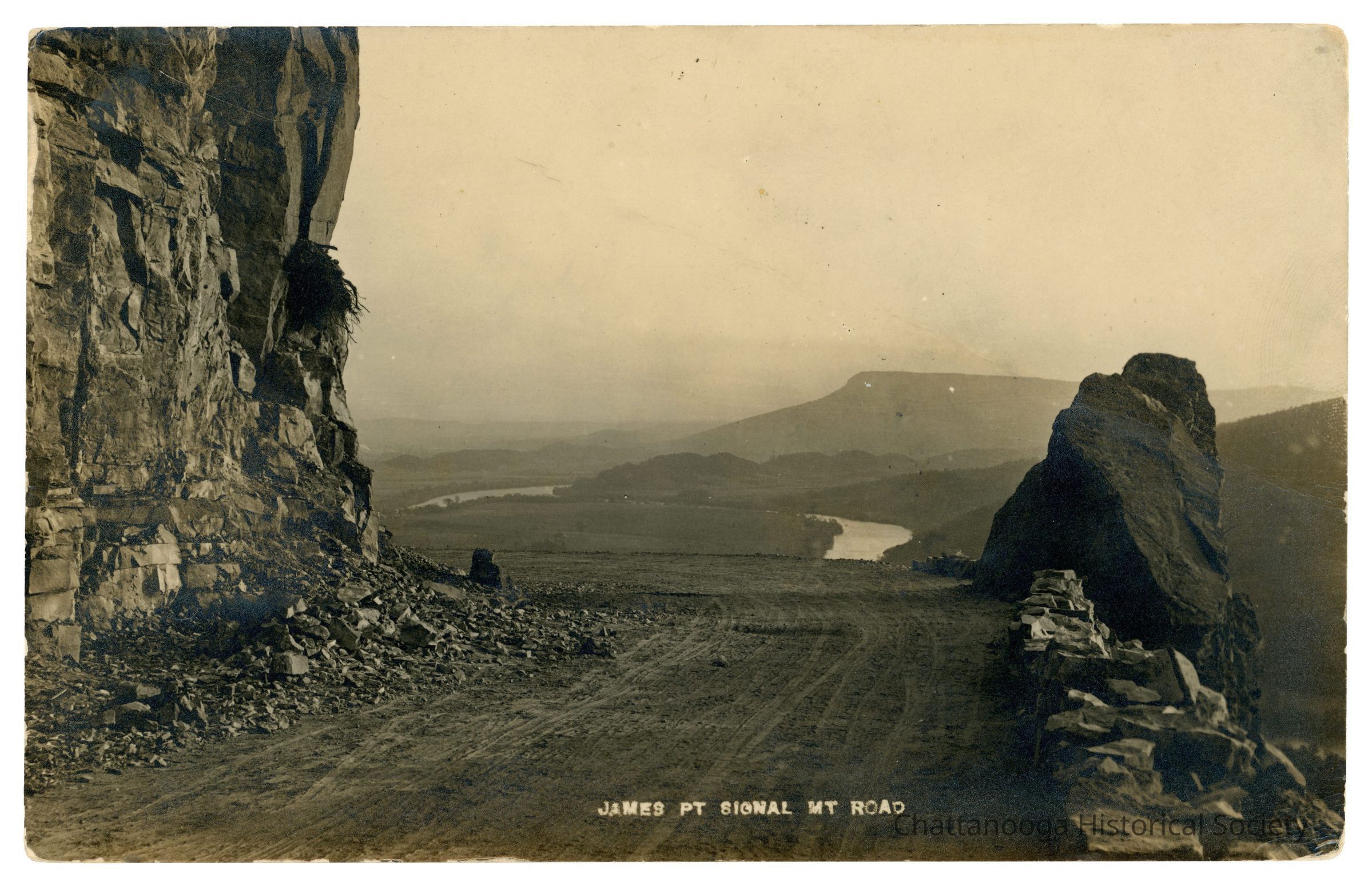 Black and white photograph developed on postcard paper showing the view of James Point from Signal Mountain Road on Signal Mountain, Tennessee. The Tennessee River and Lookout Mountain are seen in the background.Subject Place