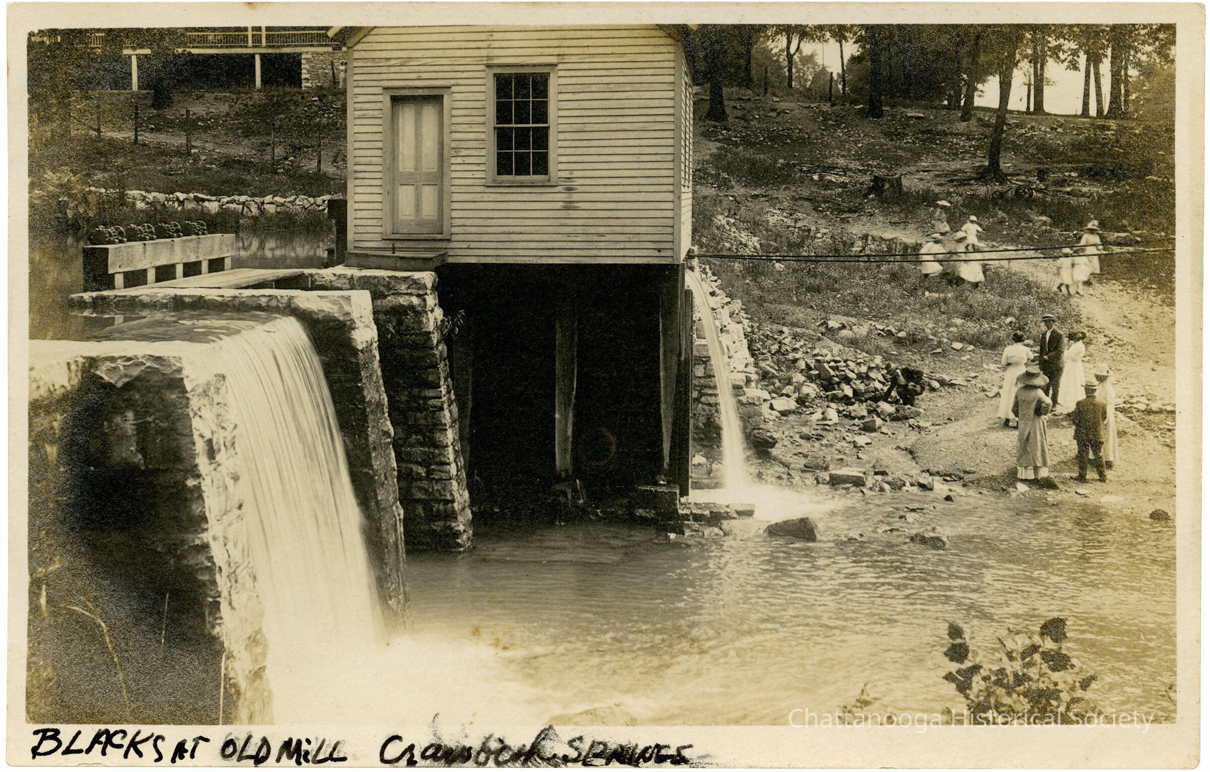 Printed in the bottom margin: "Blacks at Old Mill Crawfish Springs." Likely members of the Black family in the photograph at right