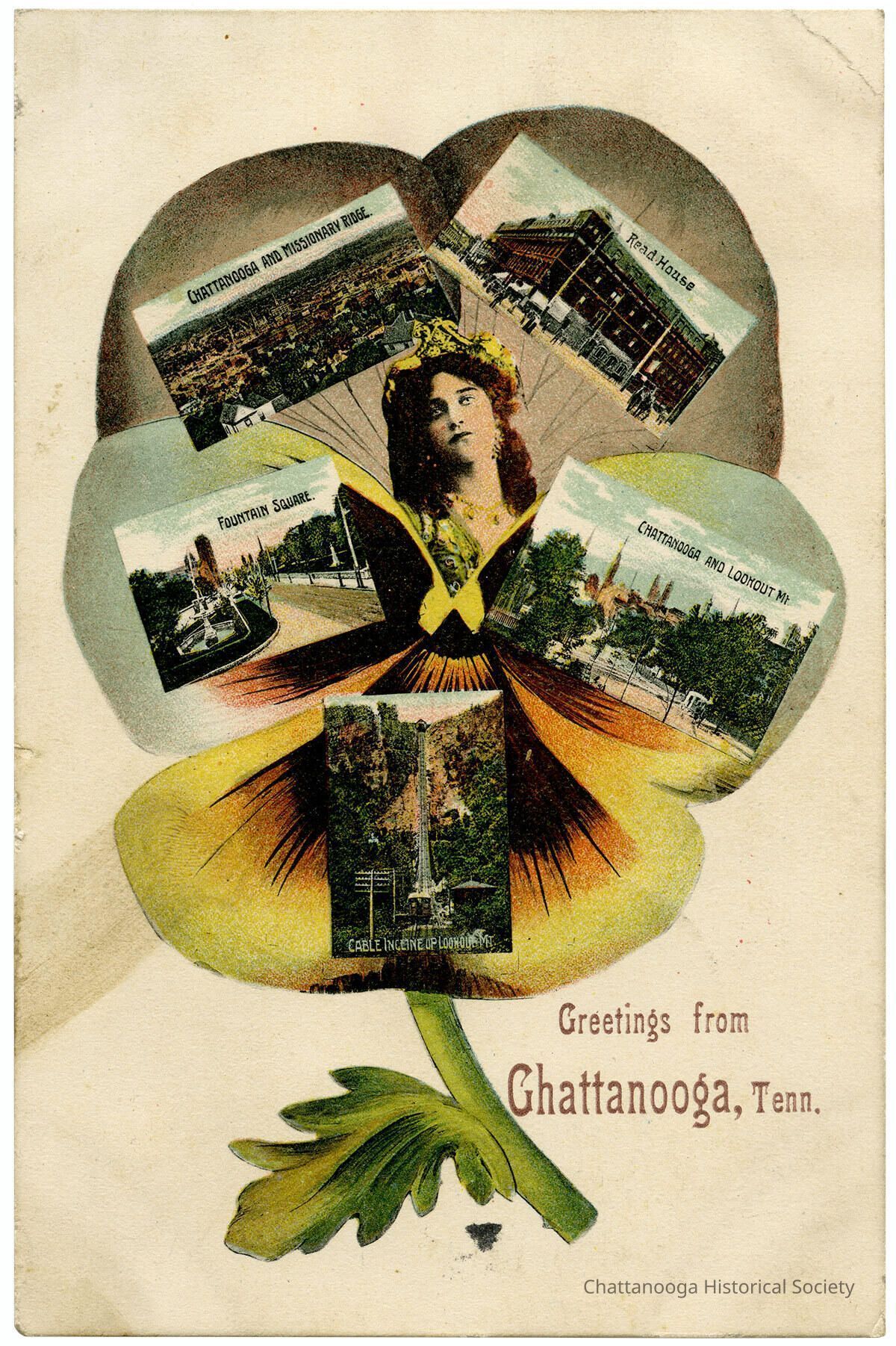 A postcard with the front showing a color-tinted photograph of a woman at the center of a pansy surrounded by scenes of Chattanooga, Tennessee, on its petals. The scenes are Chattanooga and Missionary Ridge, Fountain Square, Read House, Chattanooga and Lookout Mt., Cable Incline up Lookout Mtn.. The card reads "Greetings from Chattanooga, Tenn."Subject Place