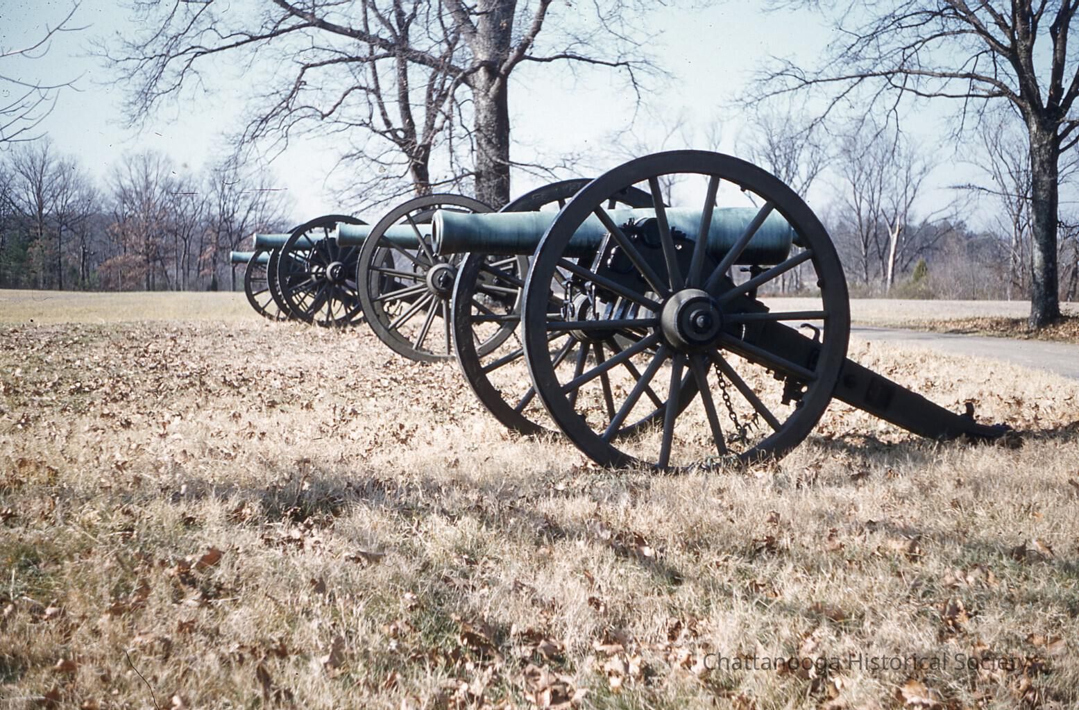 A Kodachrome Transparency slide negative showing a line of four artillery pieces in a line alongside a road, likely at Chickamauga Battlefield in Fort Oglethorpe, Georgia.