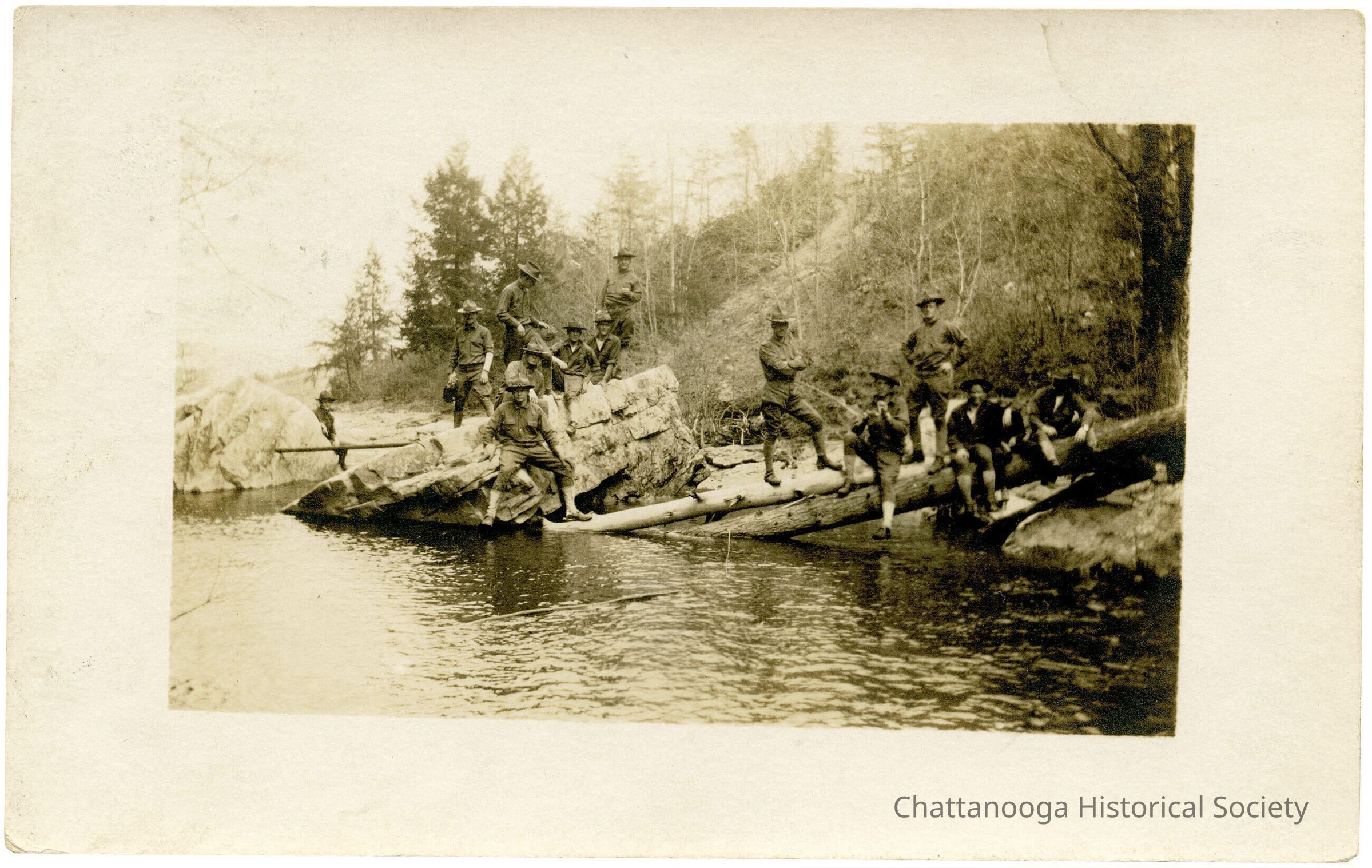 A postcard with the front showing a group of WWI era recruits posing at Lula Lake on Lookout Mountain.Subject Place