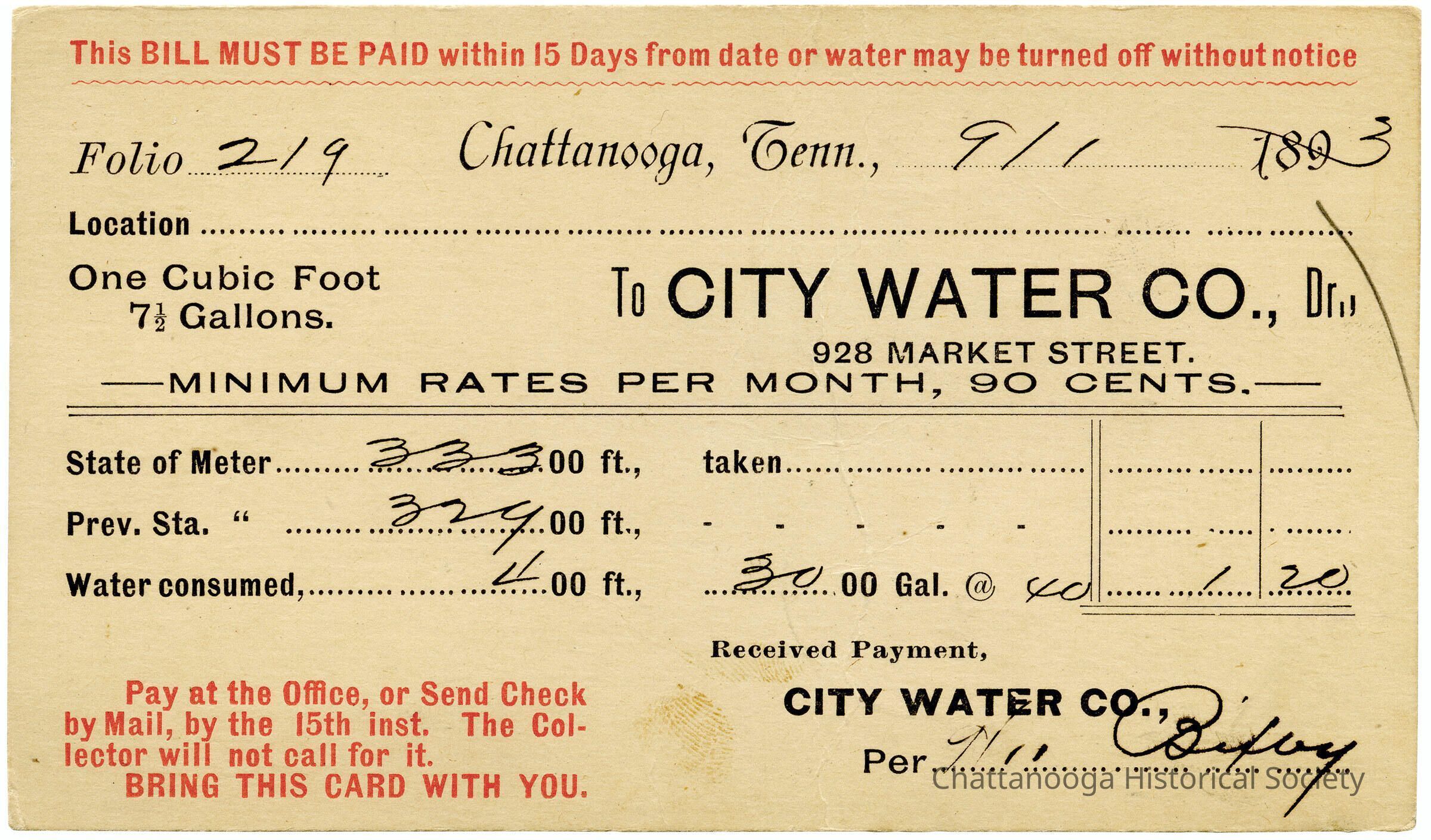 Beige Postal Card from the City Water Company at 928 Market Street. This is a statement from the utility for the John Burk Estate dated 1893.Subject Person/Organization