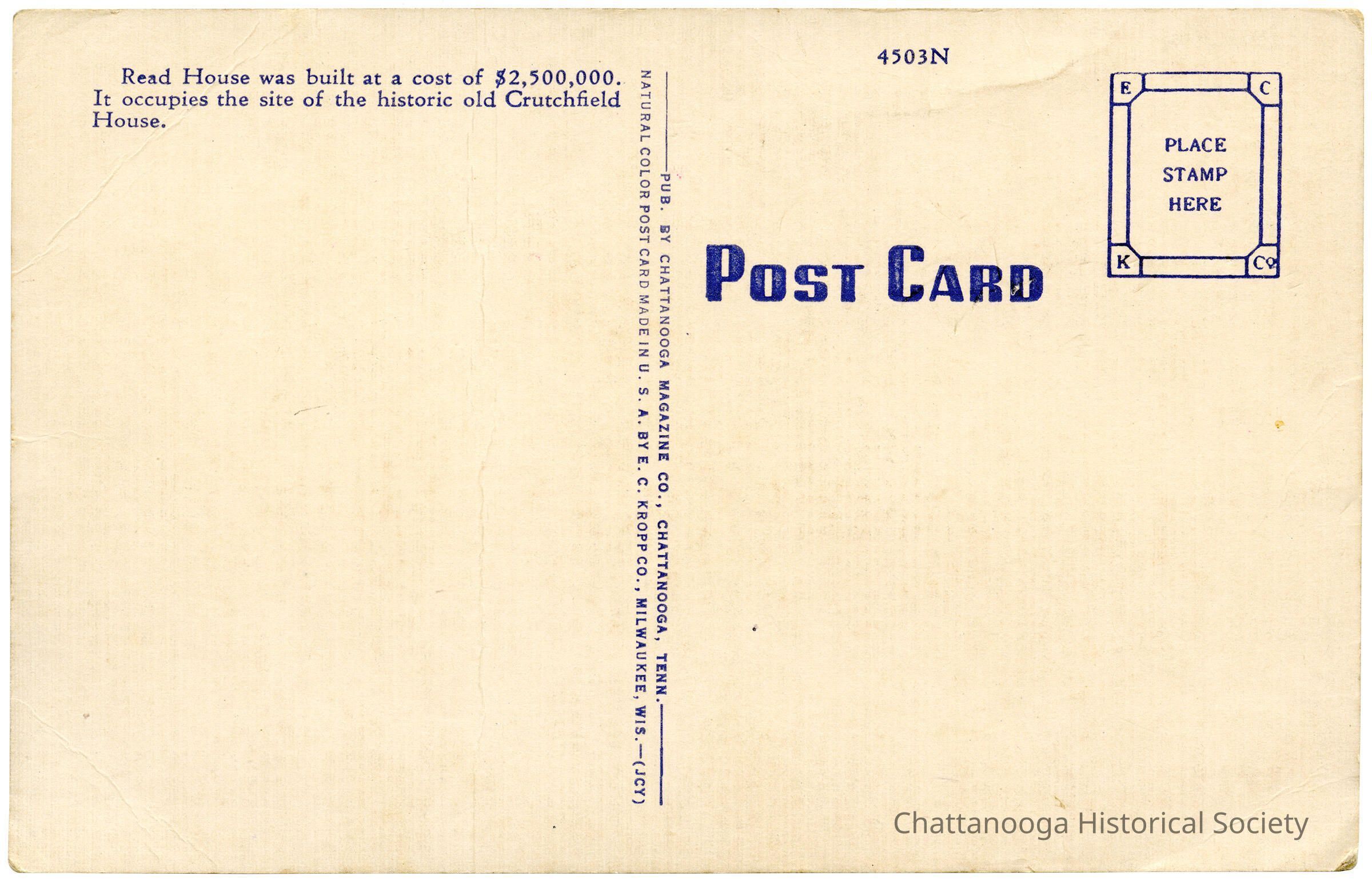 The verso reads "Read House was built at a cost of $2,500,000. It occupies the site of the historic Crutchfield House."