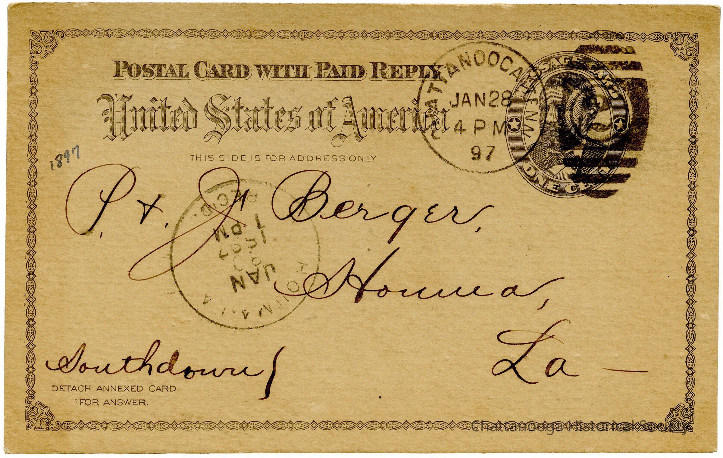 A postal card advertisement from the Chattanooga Car & Foundry Company. The postal card is addressed to P. & J. BergerSubject Person/Organization