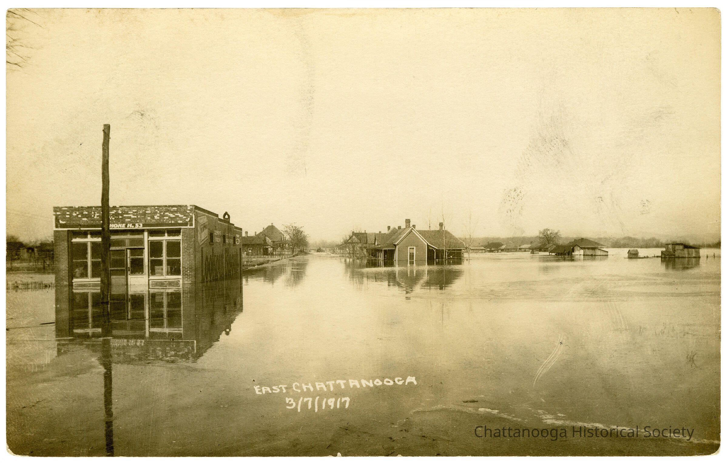 A gelatin-silver printed postcard with the front showing East Chattanooga, Tennessee, during the flood of 1917. A local business' shop is at left with the flood waters at its front door. Below the "Phone H. 53". "Lookout Biscuits" advertisements are painted on the side of the building. Homes and other structures can be seen in the background in the flood waters. The photograph is dated 3/7/1917Subject