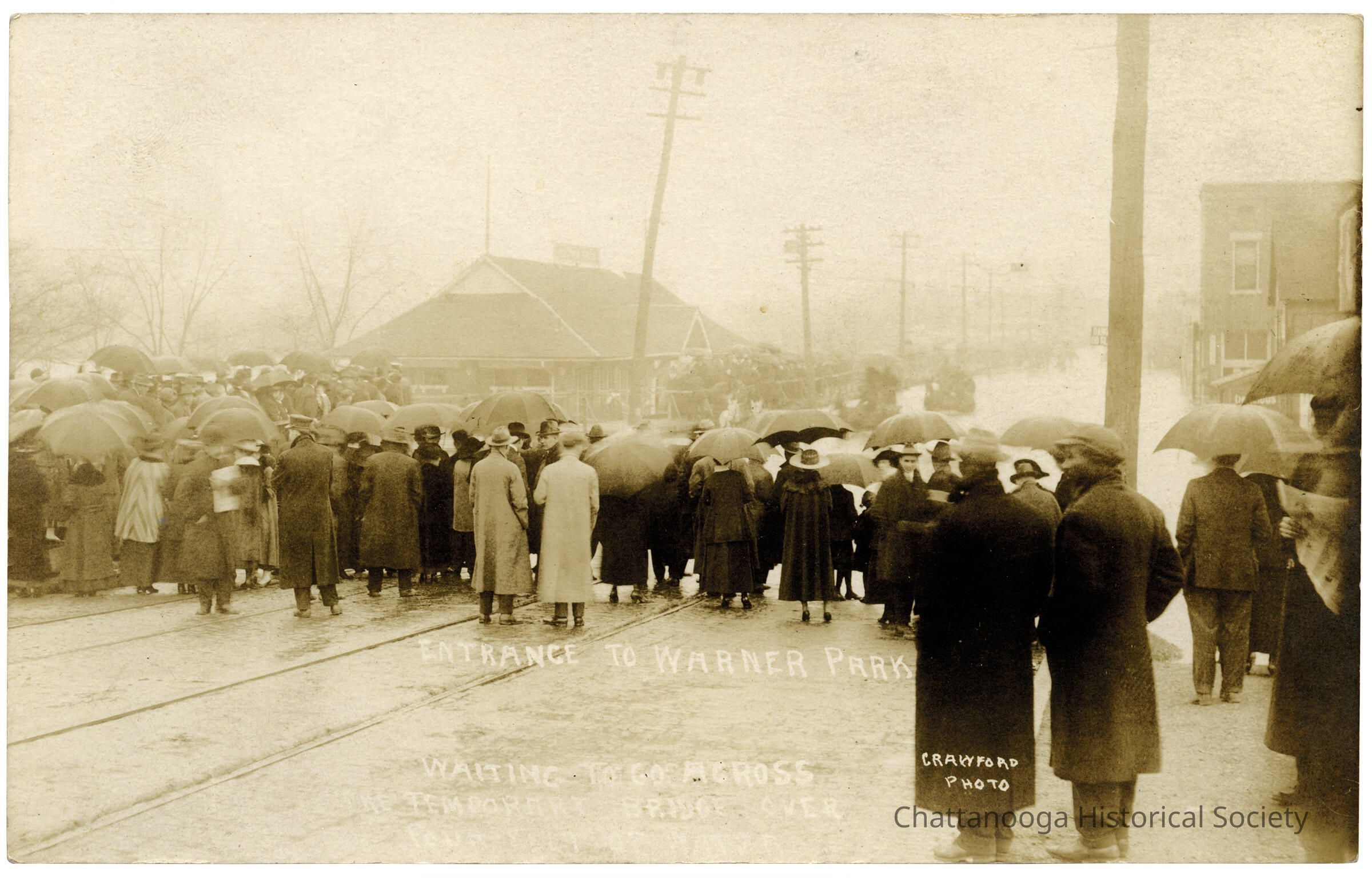 A gelatin silver printed photographic postcard with the front showing the flood damage at Warner Park during the 1917 flood. The inscription at the bottom is partially legible: "Entrance to Warner Park | Waiting to go across temporary bridge over Fourt[eenth]" and the photograph is marked "Crawford Photo".Subject