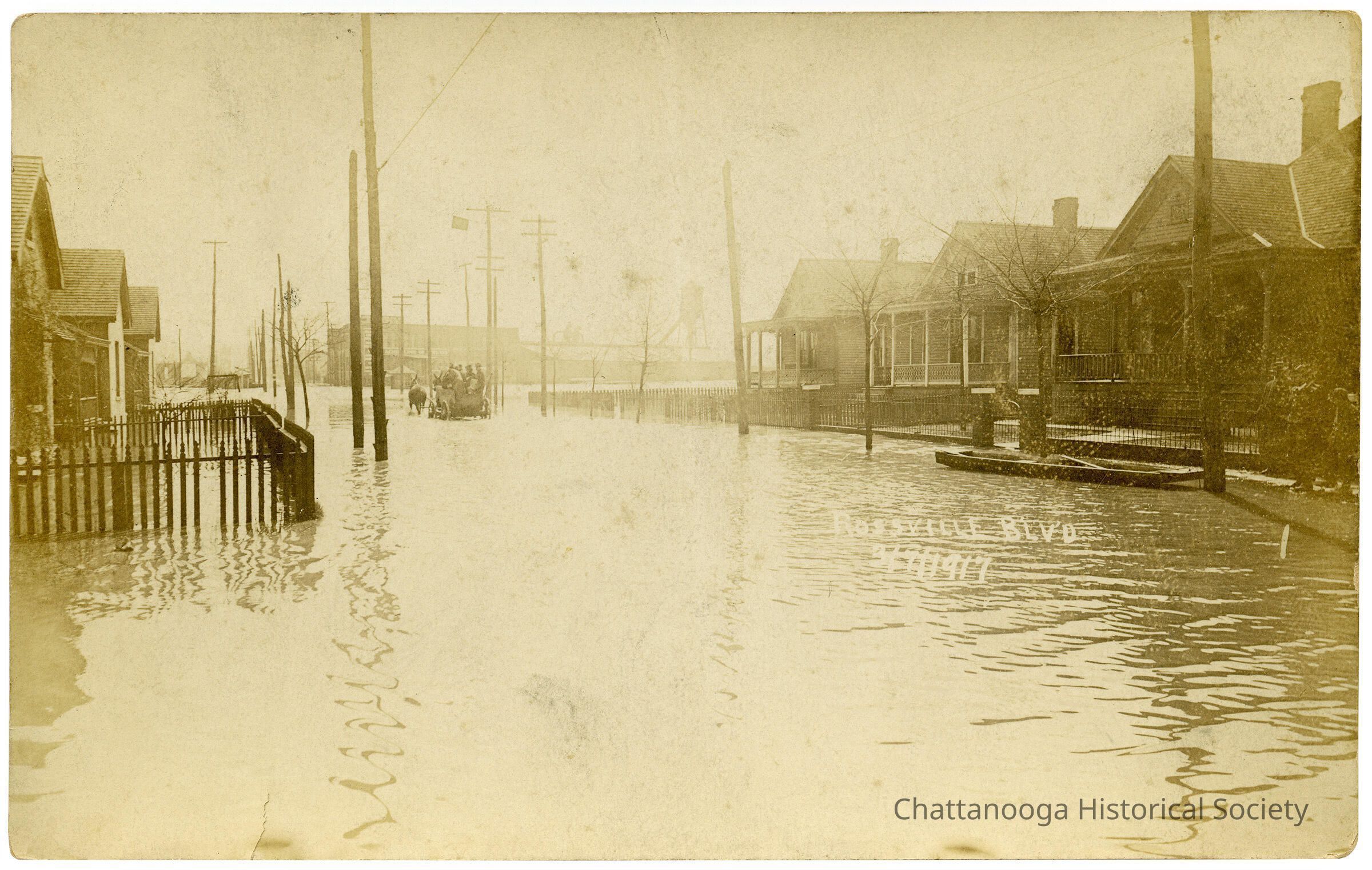 A postcard with the front showing a flooded Rossville Boulevard lined with fenced homes with flooded yards. In the foreground is a boat is tied to a pole with a group of several people standing next to it. Further away is a buggy with a group of people is pulled through the flooded road by a mule. Handprinted on the negative is, "Rossville Blvd, 3/7/1917."Subject Place