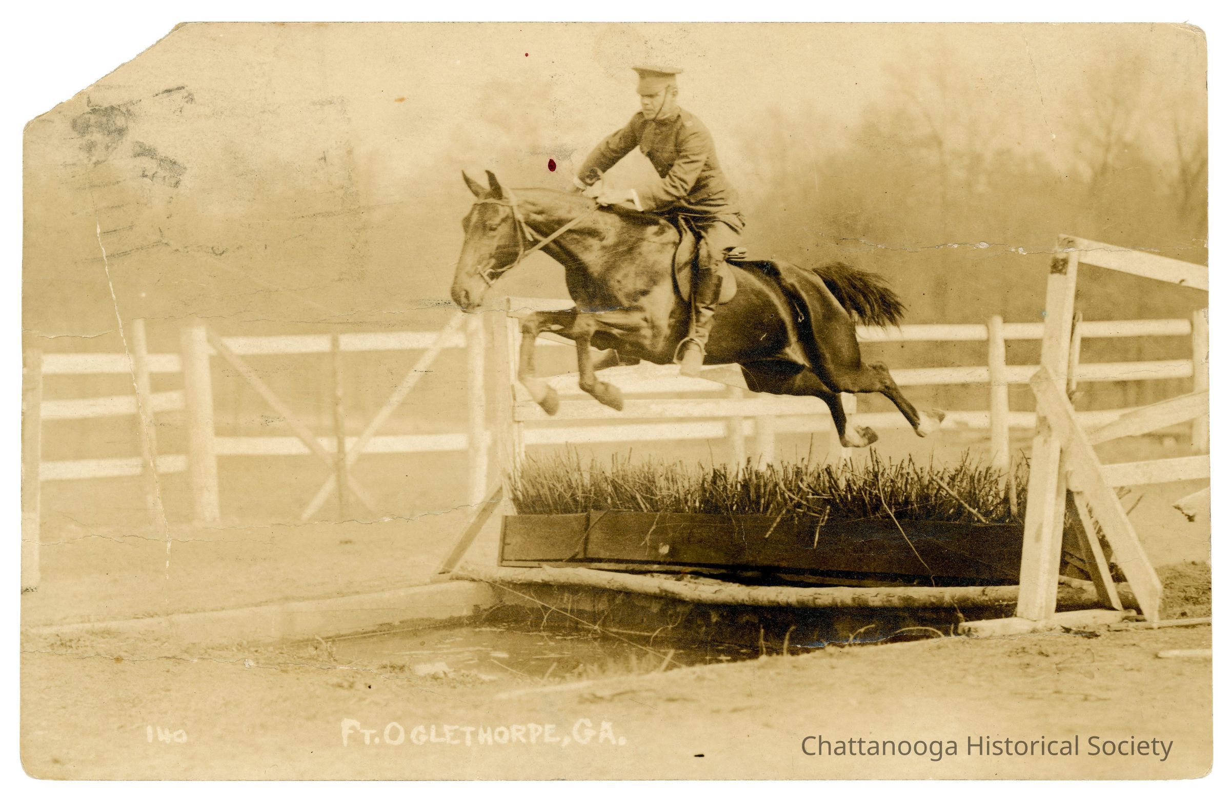 A black and white photograph developed on postcard with the front showing a photograph of a soldier riding a horse caught in mid-jump over an obstacle at Camp Greenleaf in Ft. Oglethorpe, Georgia. The image shows a dark horse on a water jump with a trough of reeds or grasses. The photograph is marked "140 Ft. Oglethorpe, G.A." at bottom.