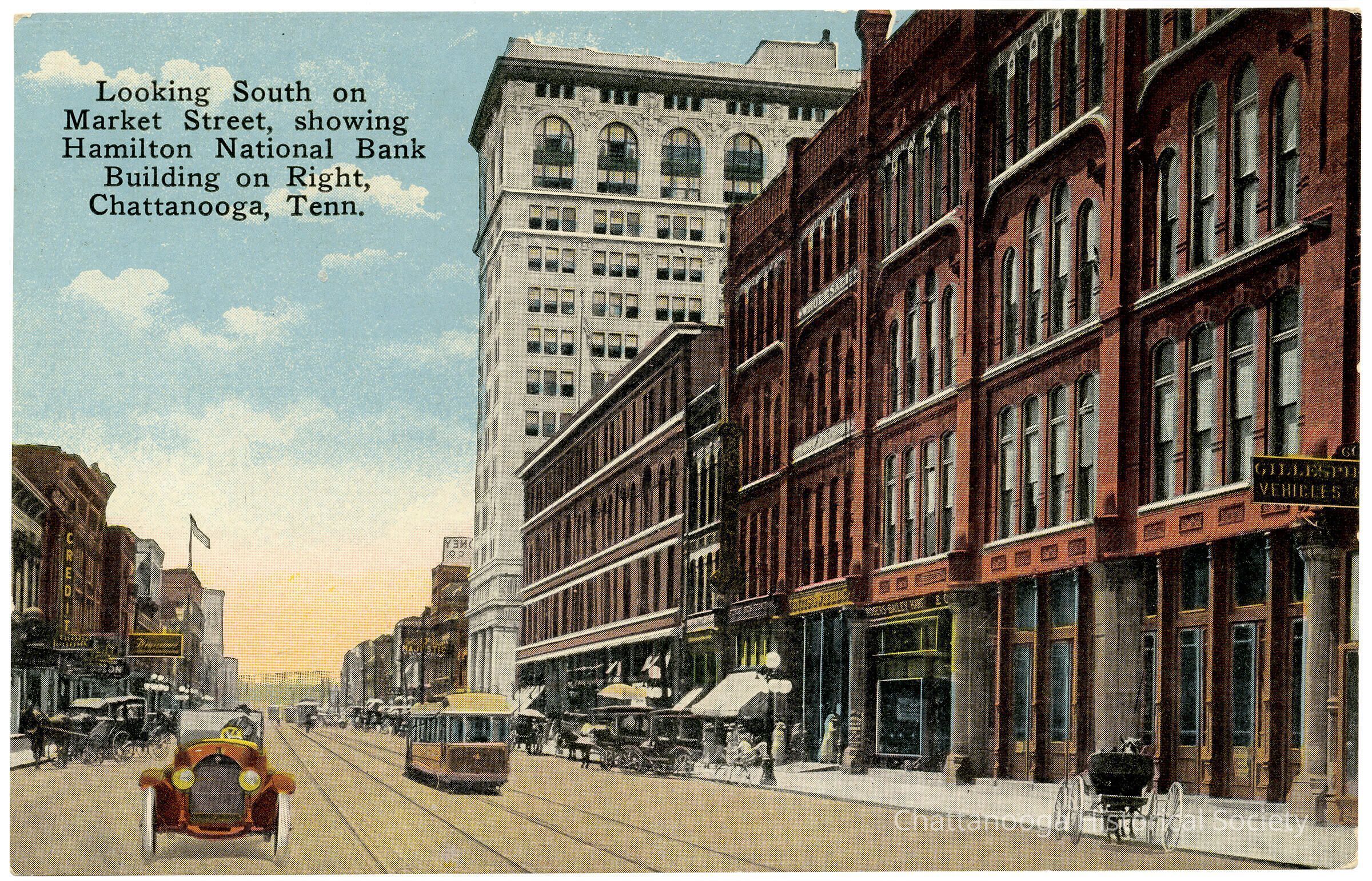 The inscription on there Recto reads "Looking South on Market Street, showing Hamilton National Bank Building on Right, Chattanooga, Tenn."