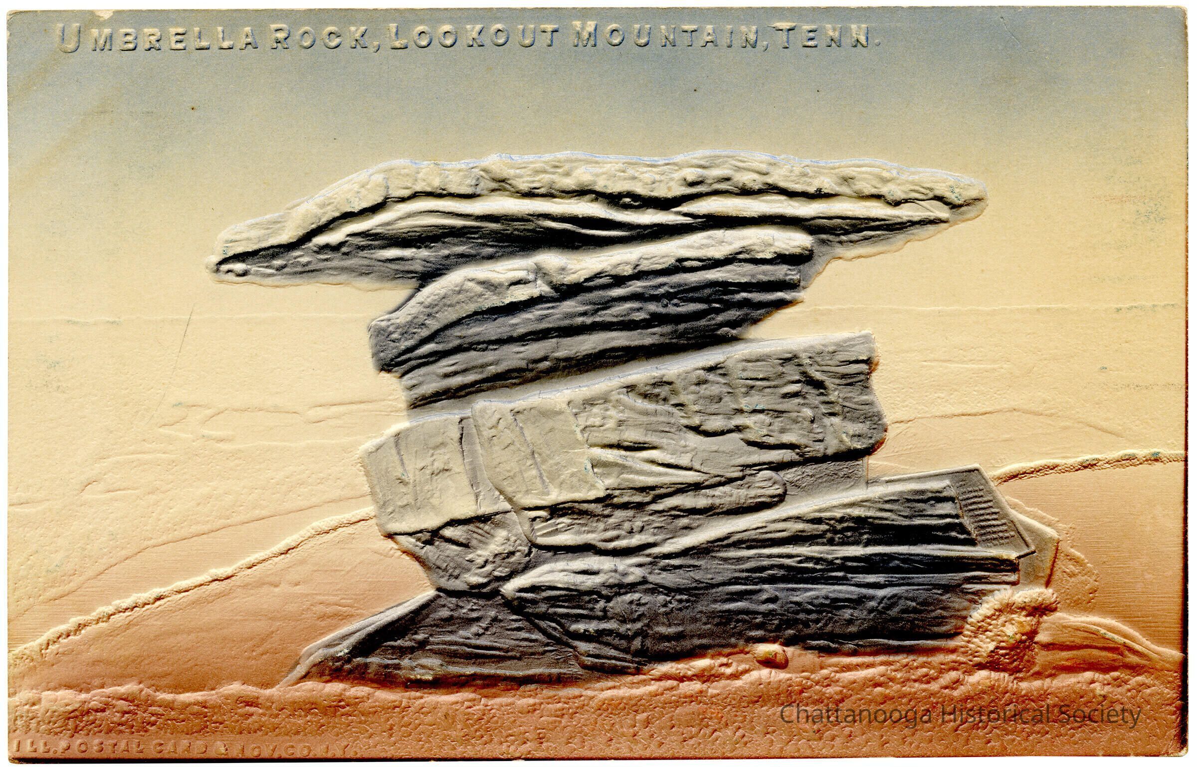 A postcard with the front showing an embossed image of Umbrella Rock and part of Moccasin Bend below.