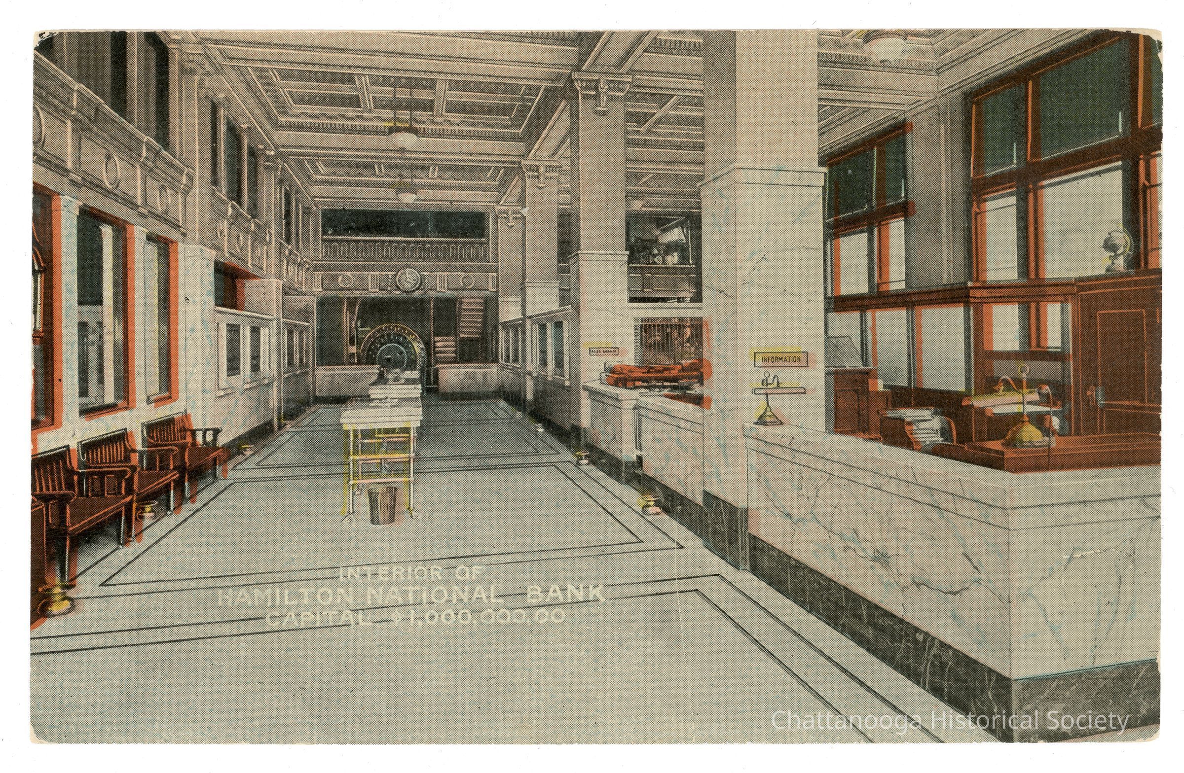 A halftone postcard showing the marble entryway lobby of the Hamilton National Bank on Market Street. The postcard shows the lobby's coffered ceiling, the information desks, teller boxes, and the seating areas. The bank safe is in the background. The postcard is labeled "Interior of | Hamilton National Bank | Capital $1,000,000.00" in white at bottom, center- left.Subject Person/Organization