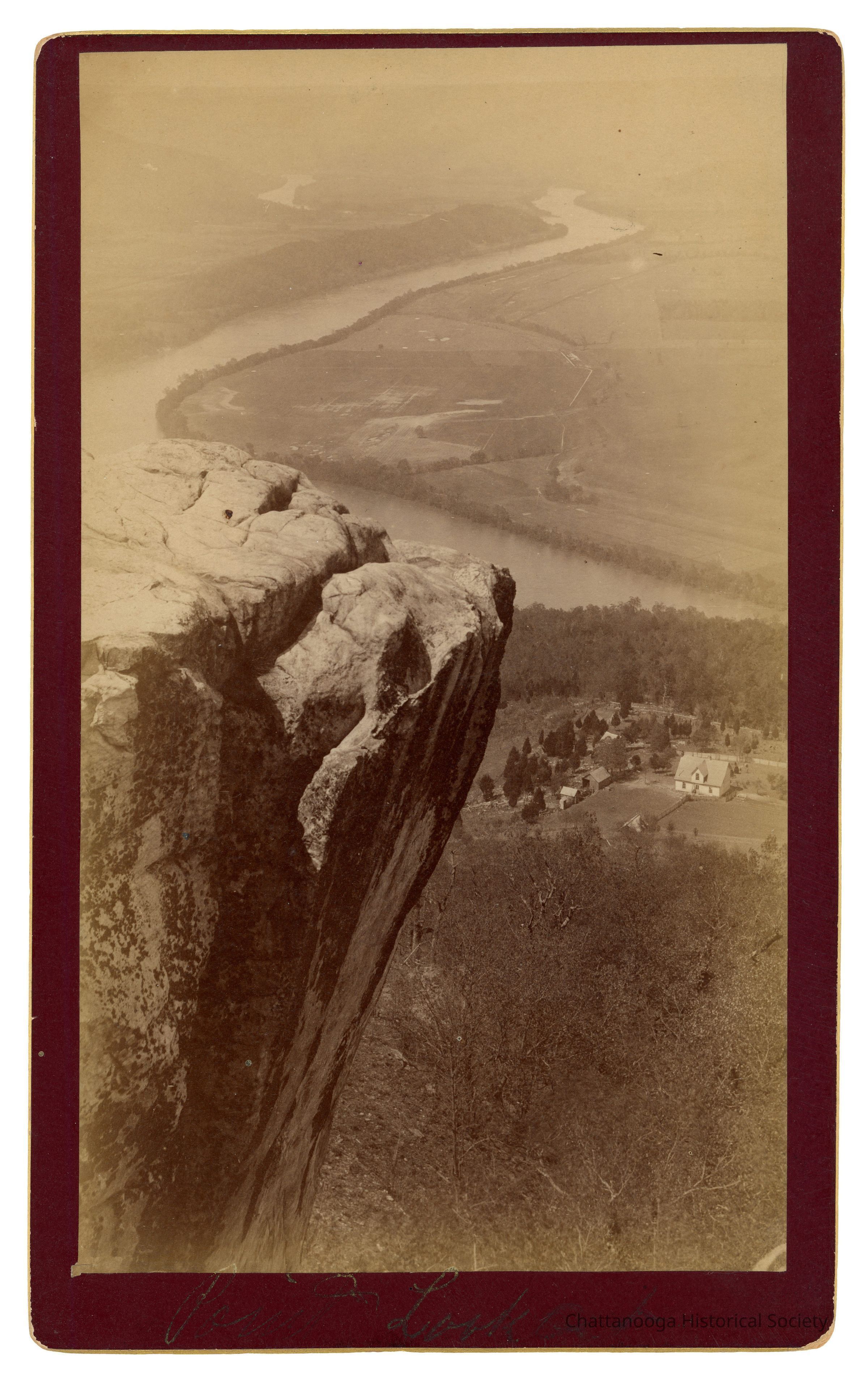 Black and white cabinet card photograph showing the Chickamauga Bluff on Lookout Mountain, Tennessee. The Tennessee River can be seen in the background. Printed on the rear is "S.S. Eaton & Co., Point Lookout Gallery, Lookout Mountain, Tenn." There are also two stickers, one that reads "Wendell C. Walker, 3209 Westonia Dr, East Ridge TN 37412" and another on that that reads "B27 | Chickamauga | Bluff | Lookout MTN | 1890's"Creator