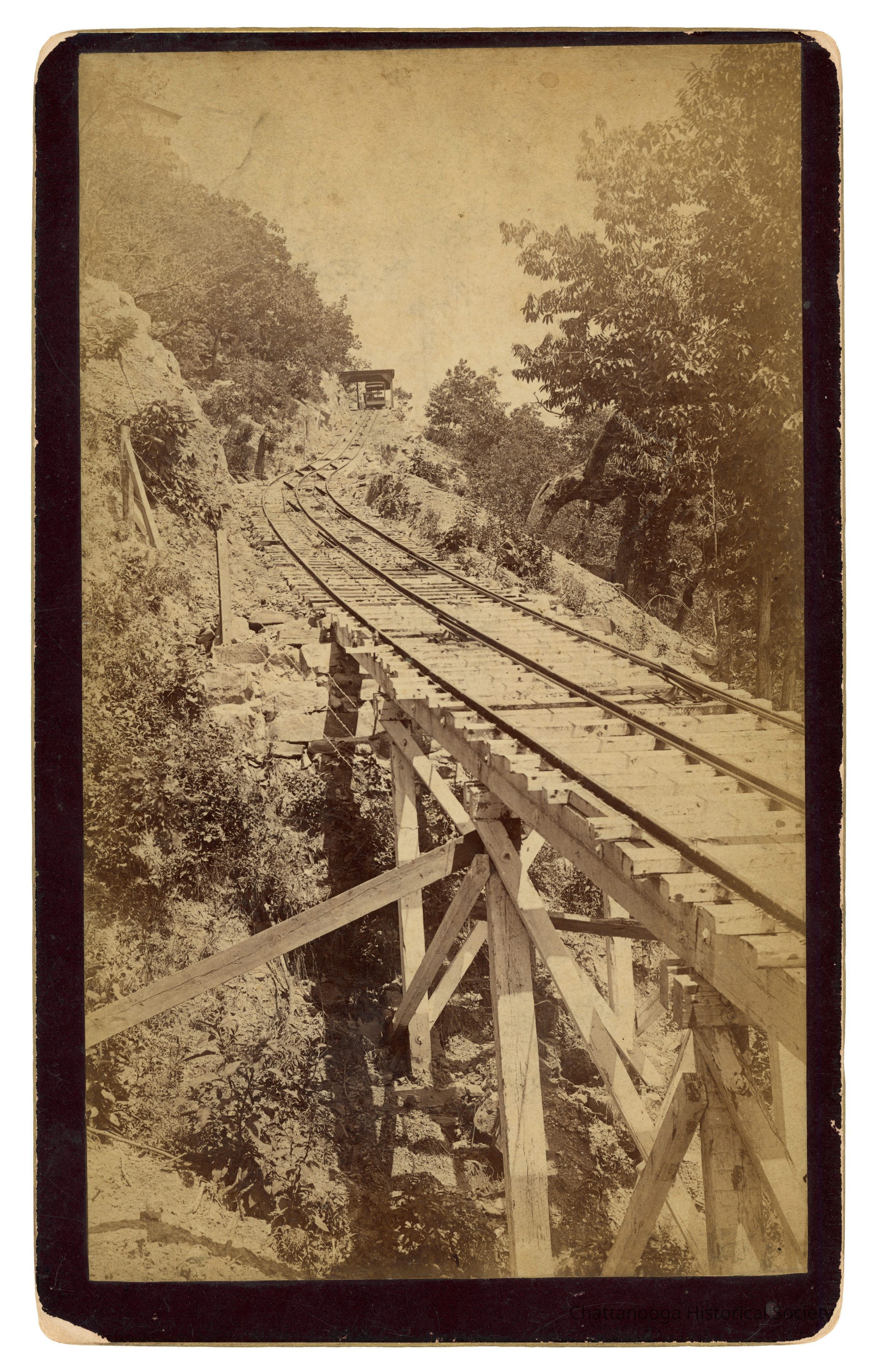 Cabinet Card photograph with gold beveled edge looking down the tracks of Incline Number 1 on Lookout Mountain, to the base. A mansion can be seen in the midground, on a rise opposite of the base station. The card is titled "Incline - Looking Down". The back in printed "J.B. Linn, & Co., Point Lookout, Lookout Mountain, Tennessee." There is a sticker on rear that reads "Wendell C. Walker, 3209 Westonia Dr, East Ridge TN 37412" .Creator