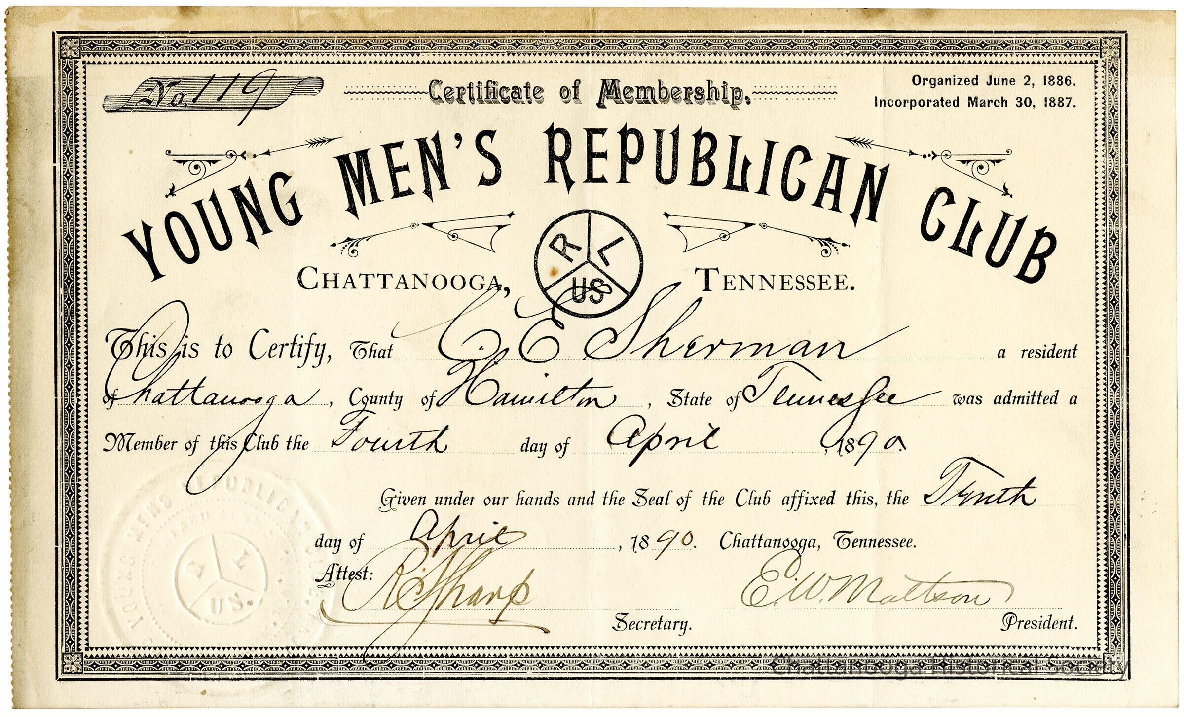A Young Men's Republican Club of Chattanooga membership certificate presented to C. E. Sherman.Archive Items Details