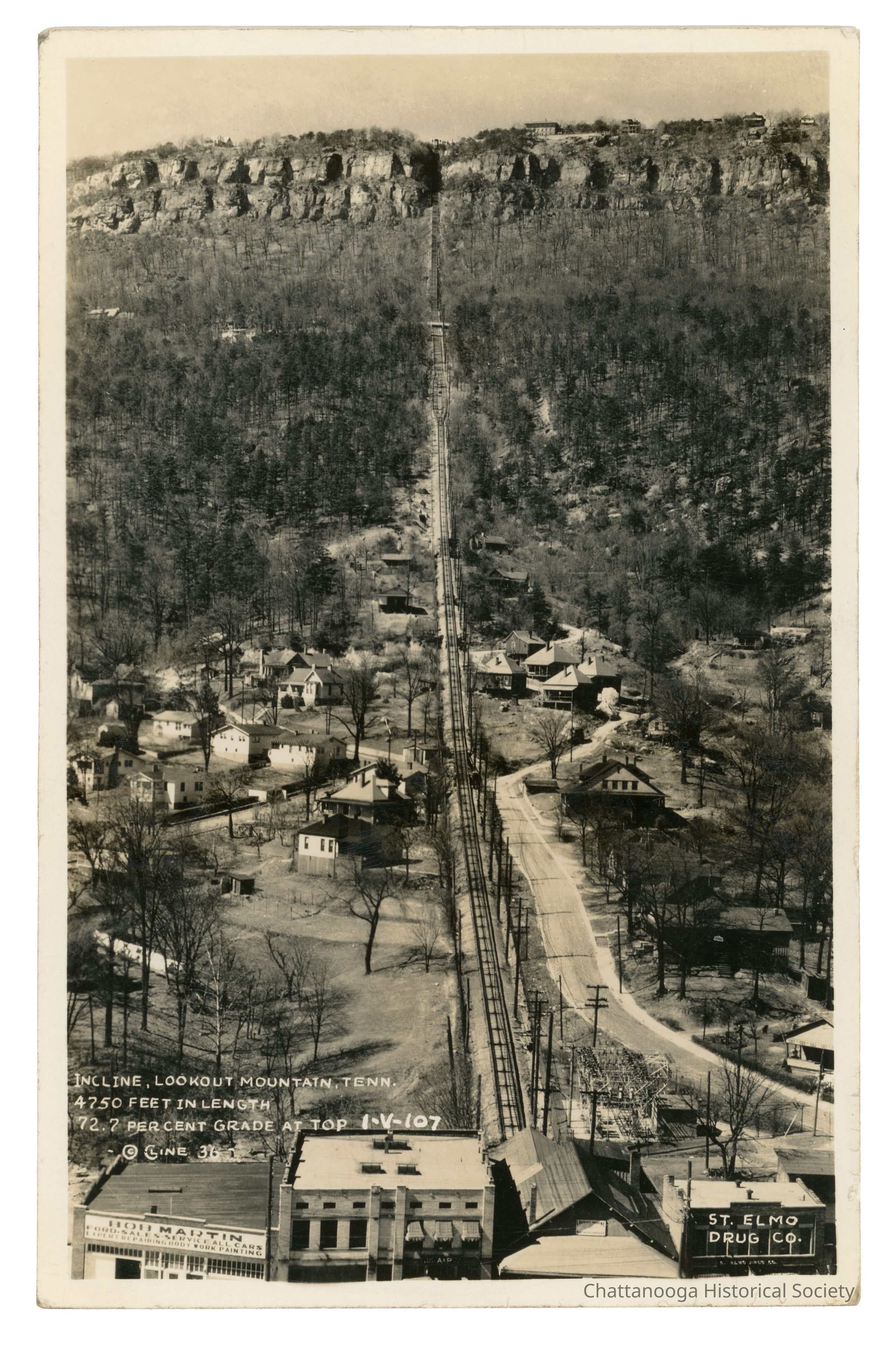 A black and white, real photo postcard showing a portion of St. Elmo's business district and the houses at the base of the Incline's track. The postcard is labeled "Incline, Lookout Mountain, Tenn. | 4750 Feet in Length | 72.7 Percent Grade At Top I-V-107 | © Cline 36" The message on the rear reads "Saturday P.M. | Sight Seeing | Home Tomorrow" and is addressed to Geo Niles Junior | 2501 Raymond Dr | Des Moines | Iowa"Creator