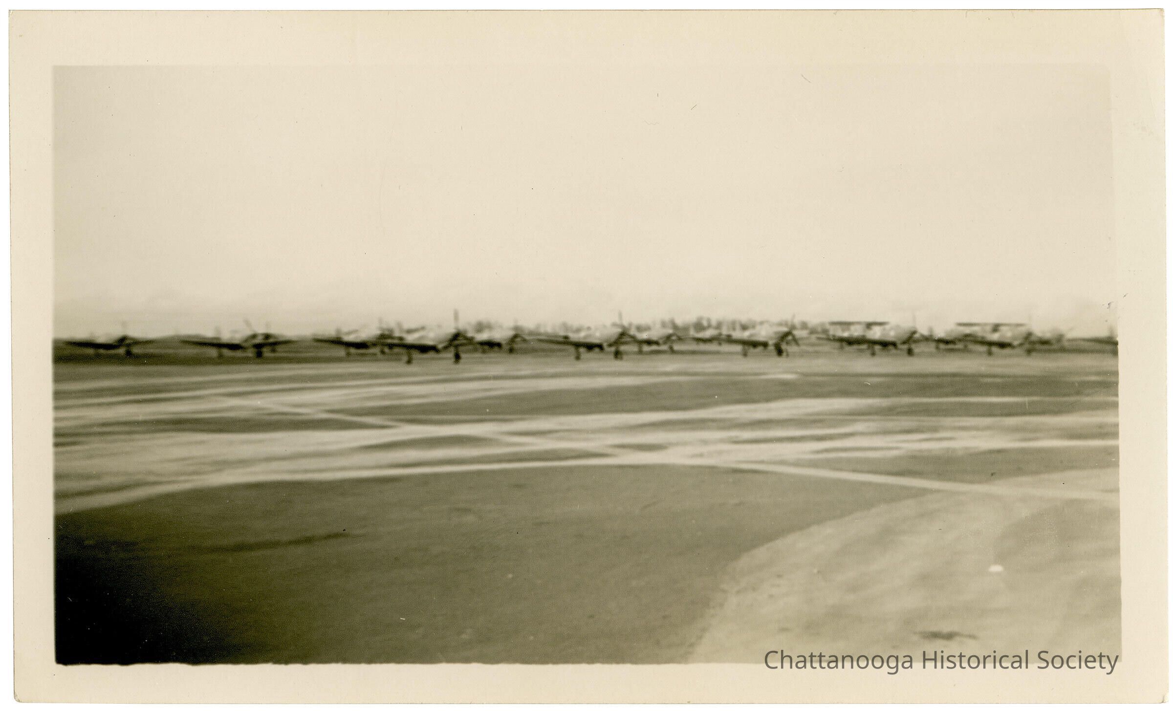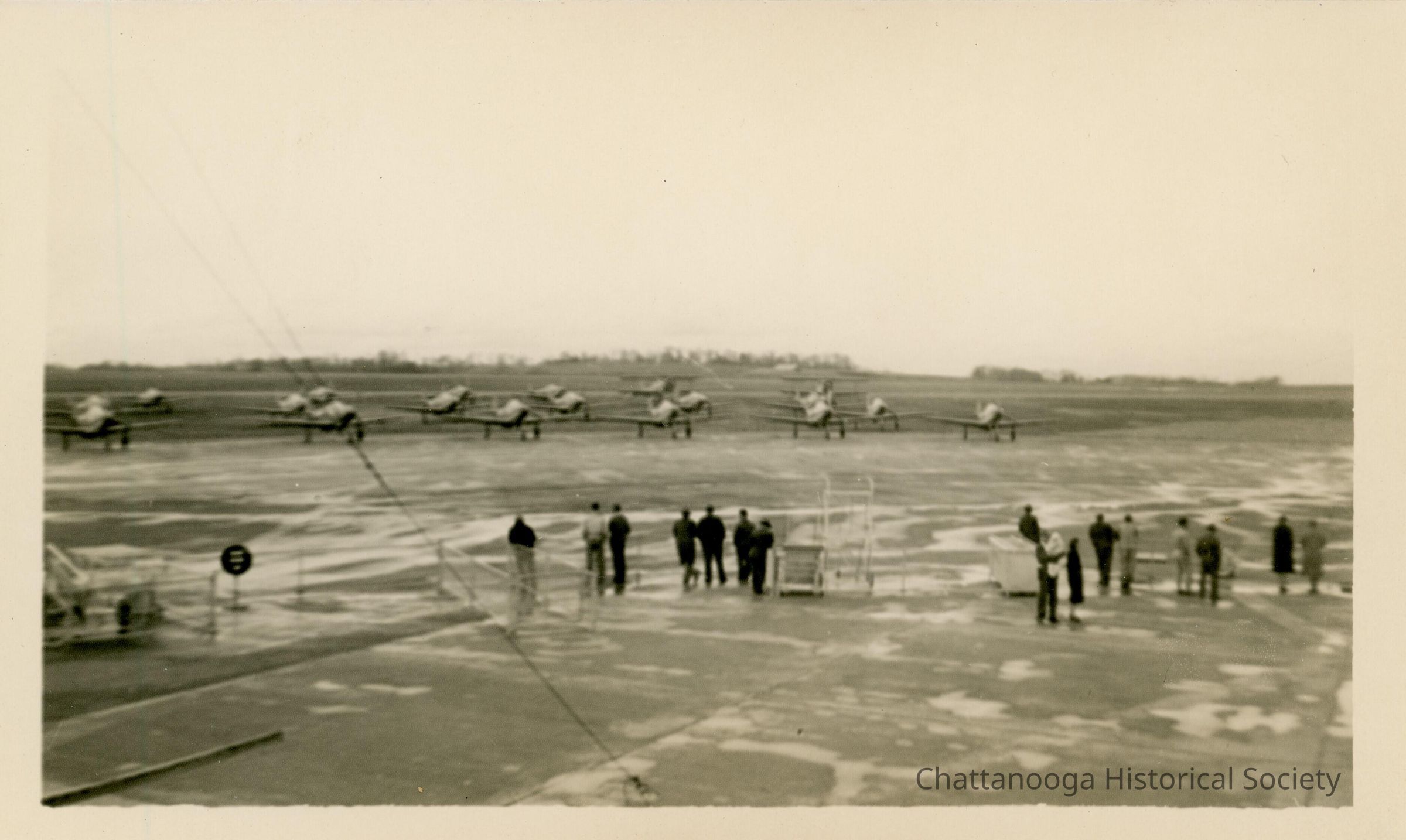 Black and white photograph of people gathered on the apron of Lovell Field, viewing parked airplanes. There appears to be some families and other people on one side of a chain-link fence, likely to keep them from entering the runway area.Date(s) of Creation
