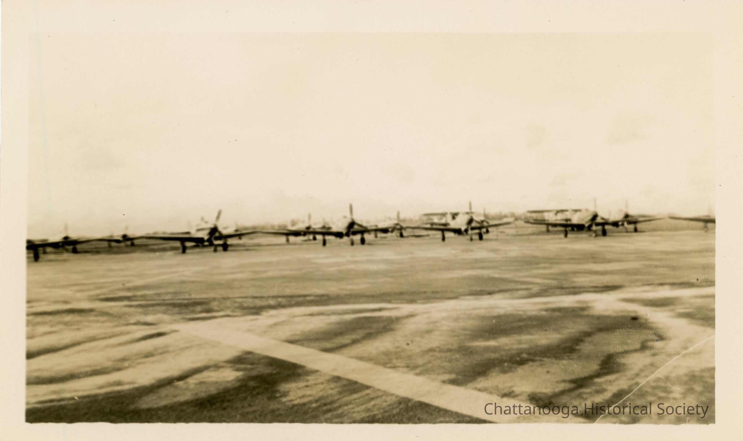 Black and white photograph of the airplanes parked on the apron of Lovell Field. There are approximately a dozen or so propeller planes lined up.Date(s) of Creation