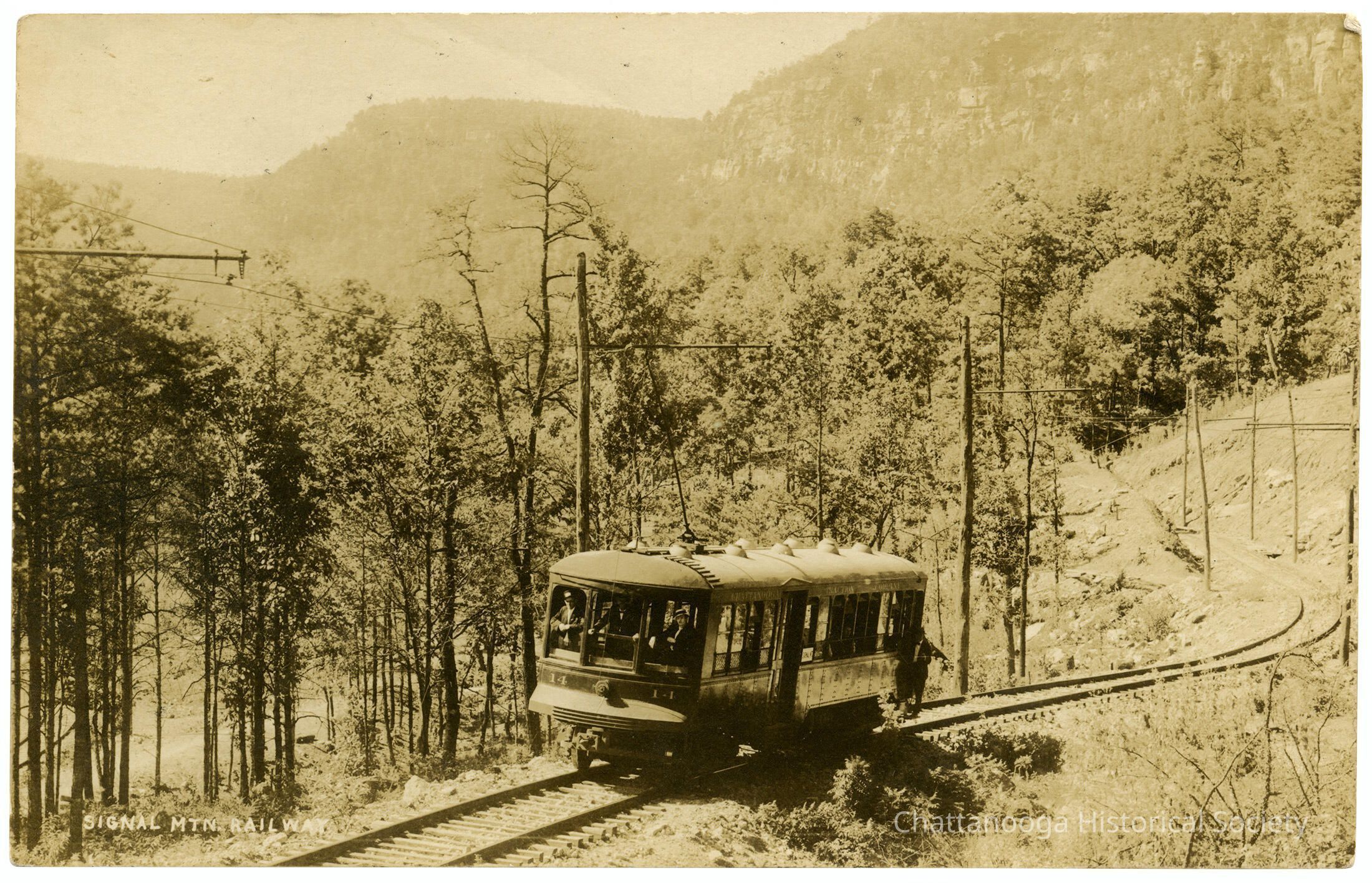 Built to serve the Signal Mountain Inn, the Chattanooga Traction Company was chartered in 1911 by C. E. James. Once finished, the 13-mile route could carry a passenger from North Chattanooga to the hotel's doorstep. As one rode up the mountain, the Tennessee River Gorge appeared beside the route, affording majestic views. A road for vehicular traffic was constructed alongside the rail line, which is still in use today. Rail service continued up to 1934 when the streetcars were decommissioned to be replaced by busses. Most of the rile line has now been removed, but portions can still be seen running down the center of James Boulevard near the former Signal Mountain Inn.Subject Person/Organization