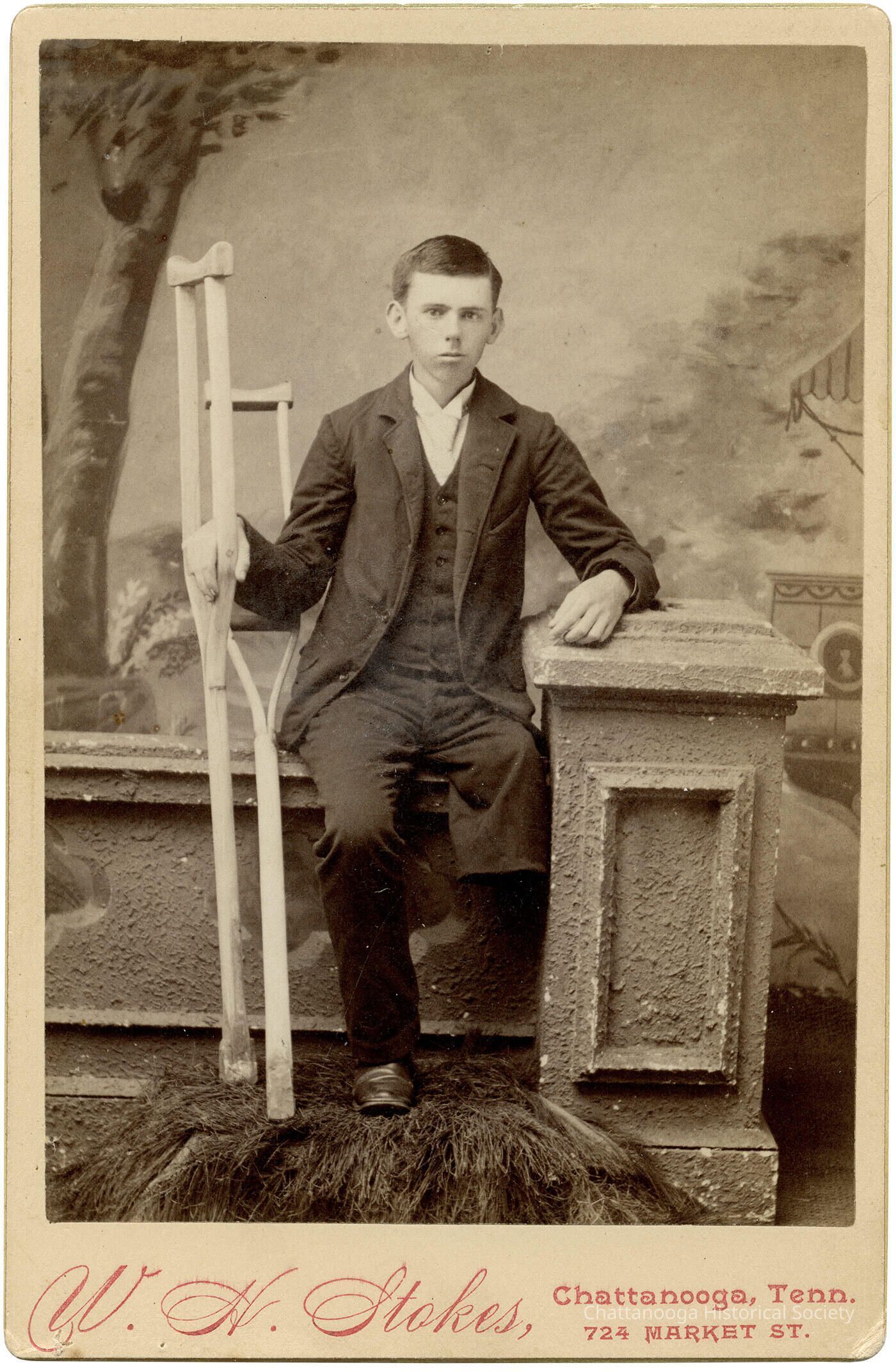 A black and white photograph mounted on a beige cabinet card with a gold beveled edge. The photograph features a young man, identified as Harris Strand Holmes, wearing a dark three piece suit. He is holding a crutch, with a second one leaning beside him, as he is a below the knee amputee. He is sitting on a stuccoed prop wall, in front of a painted backdrop. "W. H. Stokes, Chattanooga, Tenn. 724 Market St." is printed in red in the photograph's gutter.