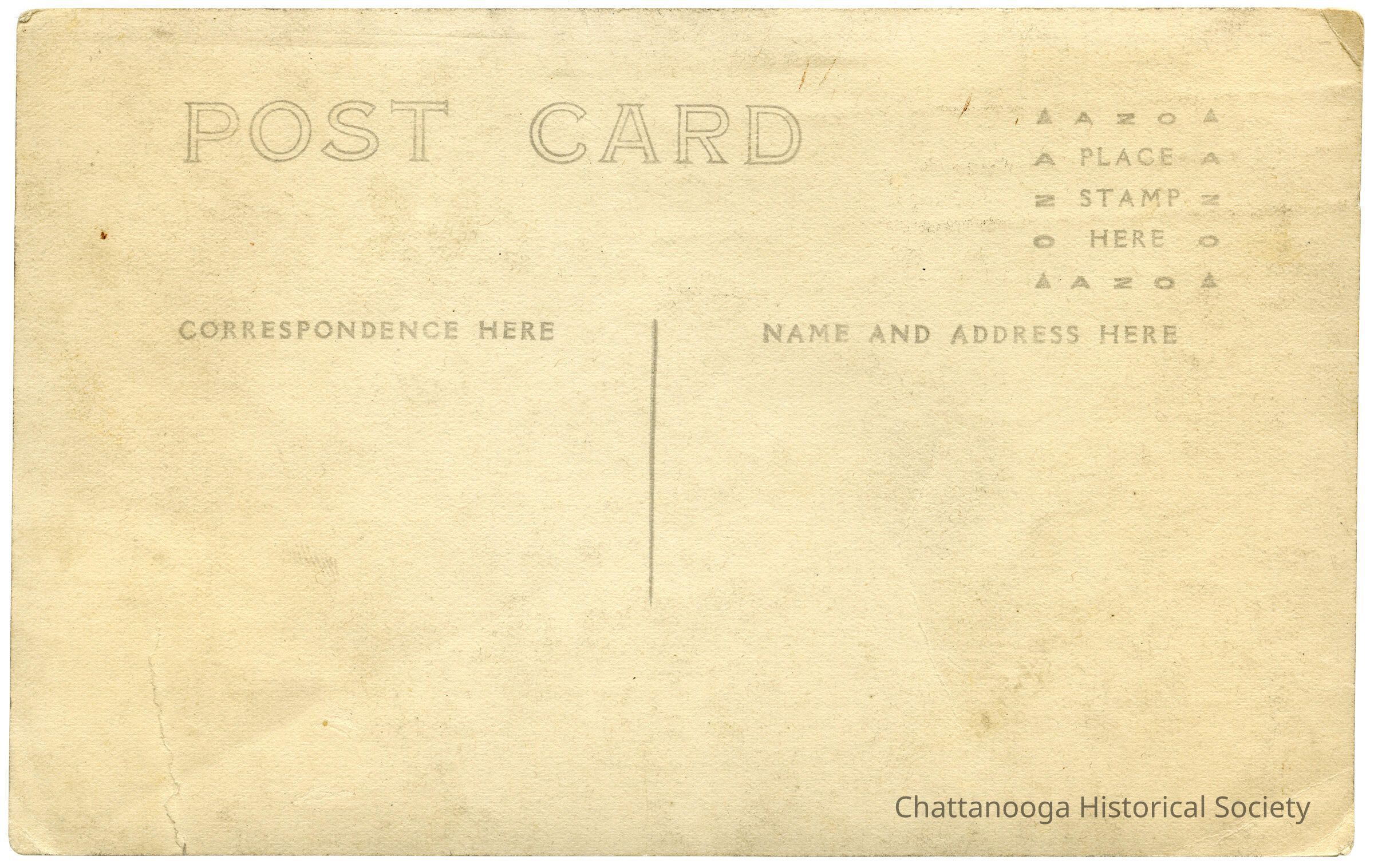 A gelatin-silver printed photographic postcard with the front showing members of the Medical Officer Training Corps (M.O.T.C.) Detachment stationed at Camp Greenleaf at the Chickamauga & Chattanooga National Military Park during World War I. They are marching north in a parade formation up Market Street during a Liberty Day event in Chattanooga, Tennessee.