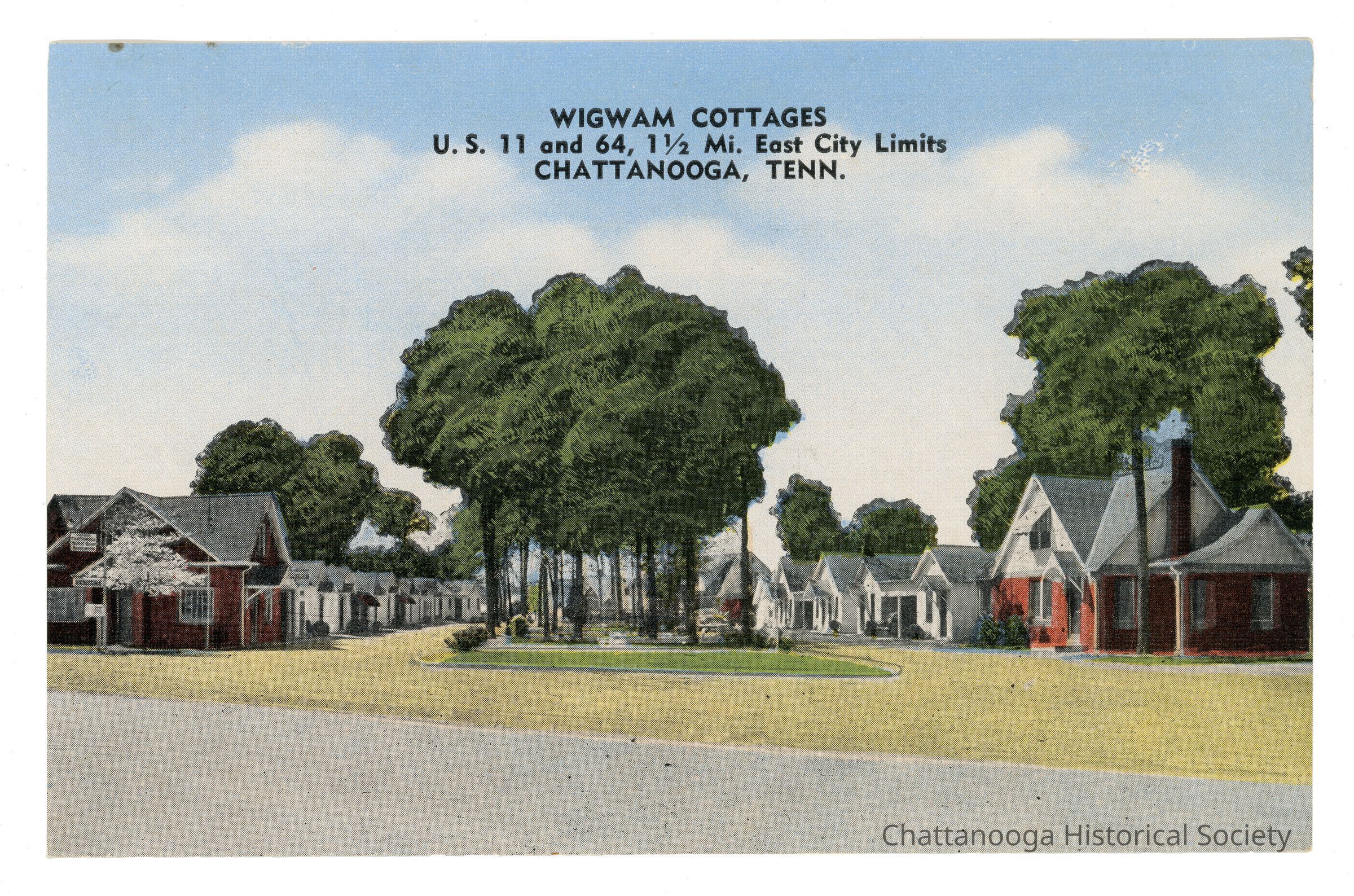 WIGWAM COTTAGES | U.S. 11 and 64 - 1 1/2 Miles East City Limits, Chattanooga, Tenn. 21 Units - Private Baths". Typed on the rear, likely by the publisher, is "Wigwam Cottages | 12,500 8-12-53 5NC"Subject Person/Organization