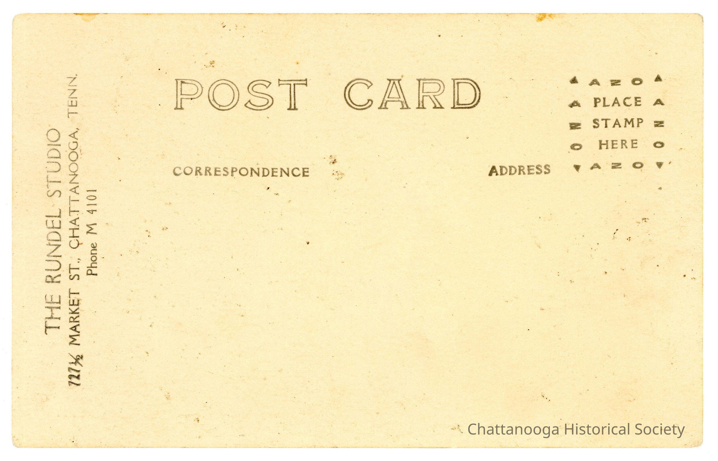 Real photo postcard showing a young student from Chattanooga High School in the school's military uniform. He is sitting for a studio portrait, with a painted backdrop behind him. Stamped on the verso, along the left edge, is "The Rundel Studio | 727 1/2 Market ST., Chattanooga, Tenn. | Phone M 4101"Photograph Details