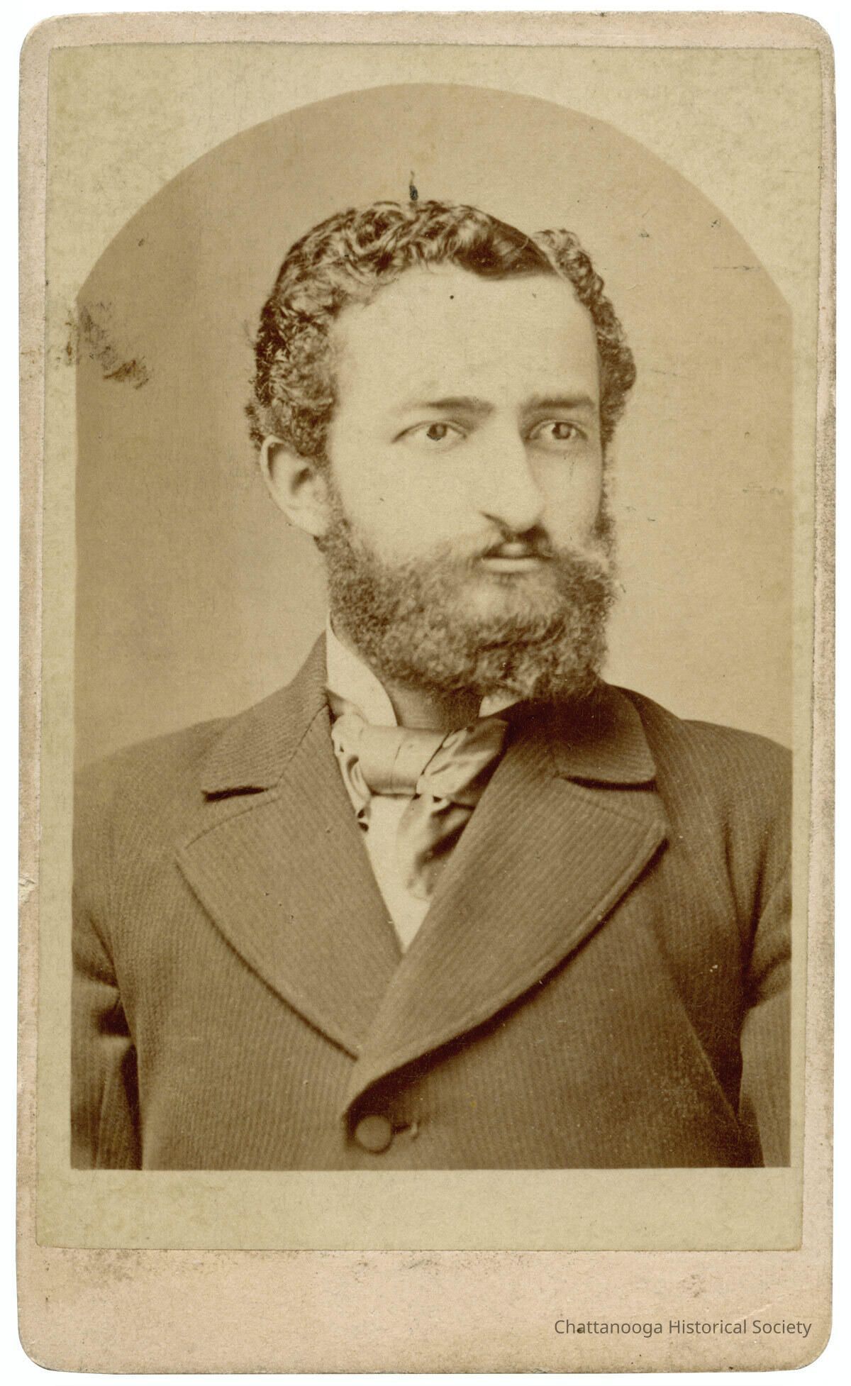 A carte de visite of a bearded man with curly hair. The CDV portrait is of a man wearing a dark, pinstriped shirt with a high white collar and a silk necktie. The back is a pink color with a beige imprint ot the Judd logo, a moth on a branch with "Judd, Chattanooga".Photograph Details