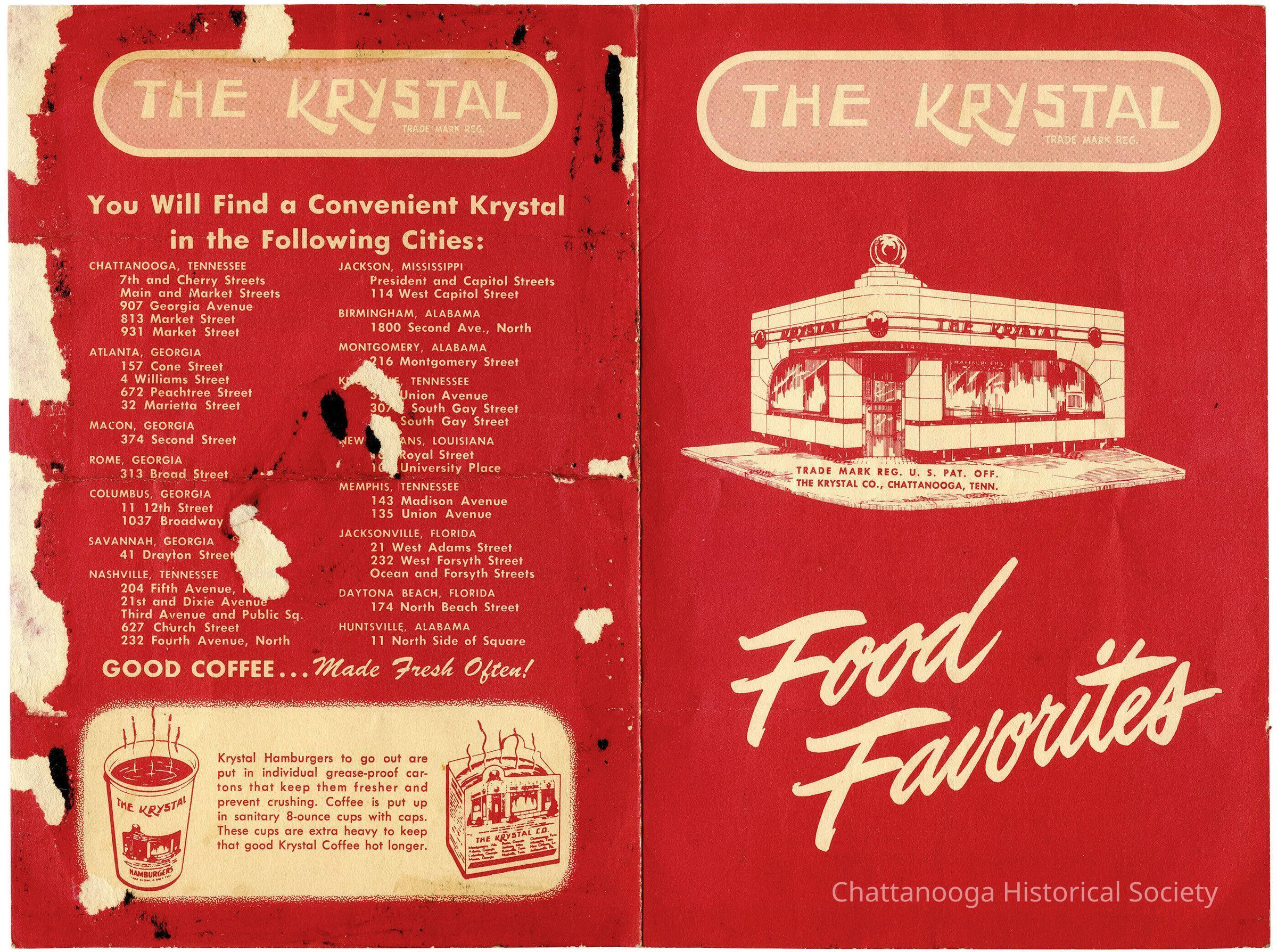 A paper, bifold menu from The Krystal chain of restaurants. The menu is red with white fonts and pink accent. The front cover features an image of a typical Krystal restaurant with "Food Favorites" written underneath. The menu items inside include the breakfast menu and other specials like 12 cents Krystal Burgers and coffee for 7 cents.Collection