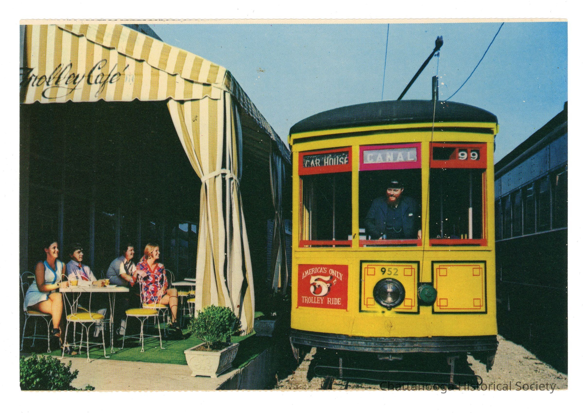 There were two nearly identical trolleys as a part of the Chattanooga Choo Choo complex, Research online lists that one of the trolleys was originally built in 1924 by Pearly Thomas Car Works of High Point, NC for use in New Orleans until 1960. The trolley was then purchased by the Tennessee Valley Railroad Museum for restoration and was put into service in 1973 when the Chattanooga Choo Choo complex opened. Unfortunately, the trolley's were virtually identical and the numbers (952 & 953) were switched out when it was repainted.Subject Person/Organization