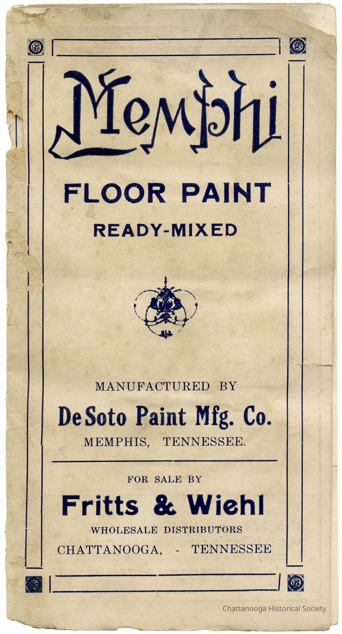 A fold-out brochure for Memphi Floor Paint, distributed through Fritts and Wiehl Wholesale Distributors on Market and Broad Streets. Manufactured by the DeSoto Paint Manufacturing Co. of Memphis, Tennessee.