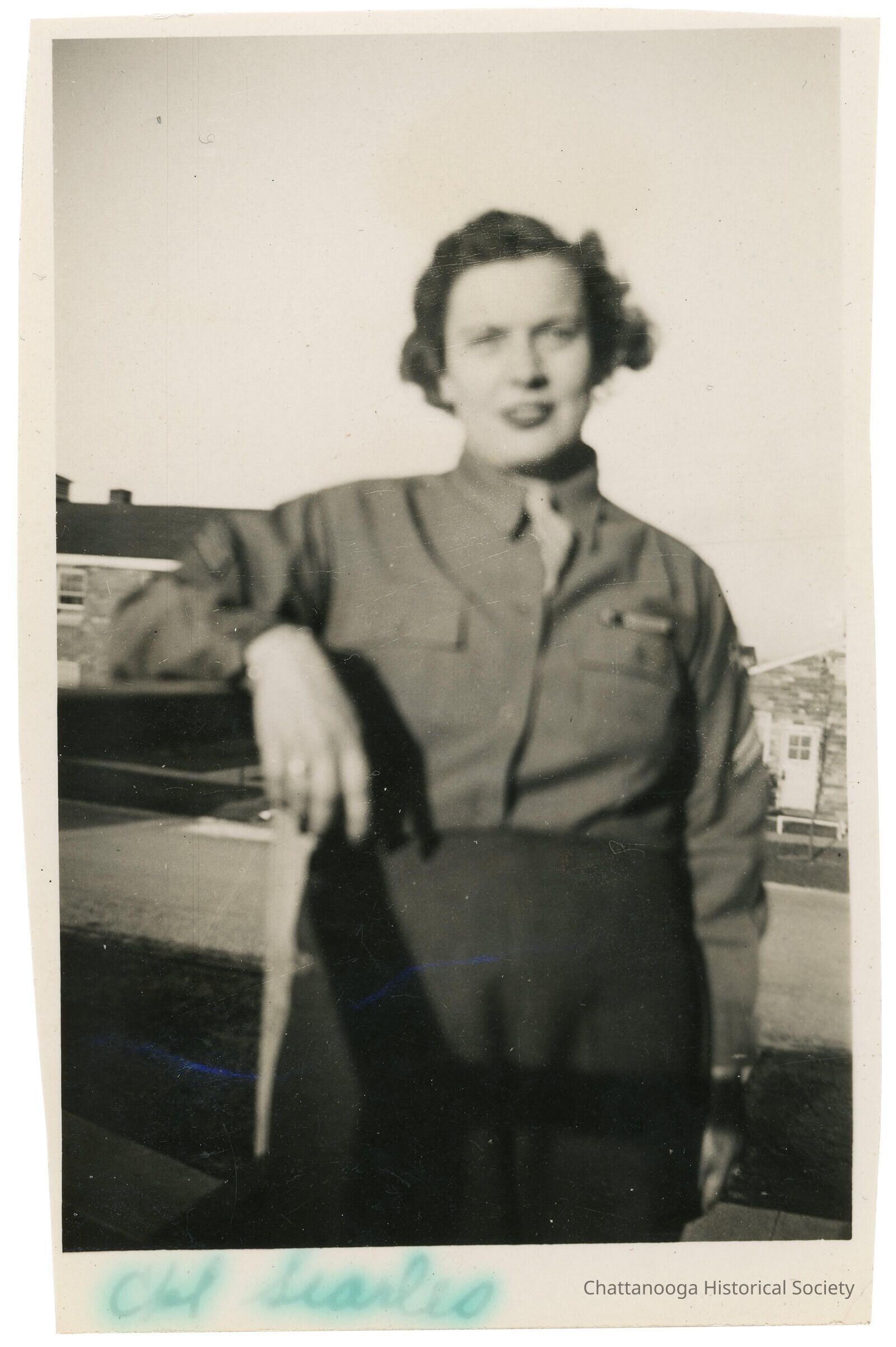 Black and white photograph of a woman Woman's Army Corp Servicewoman, Corporal Searles. She is wearing a dark olive shirtwaist and khaki tie. The corporal rank insignia is on her shoulder. There are two buildings in the background, behind both of her shoulders. "Cpl. Searles" is written in ink in the bottom white border but has faded to a green tone.Photograph Details