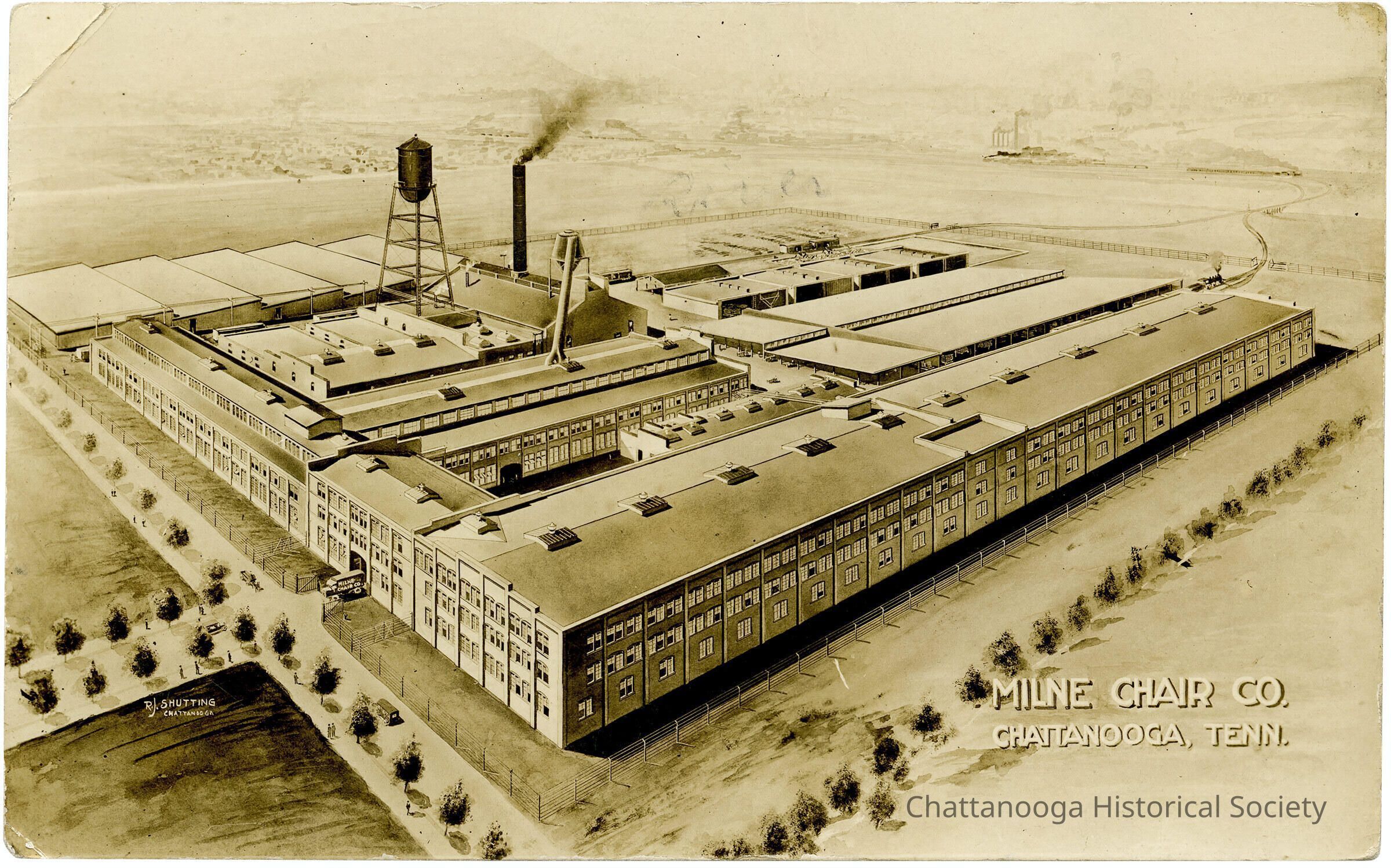 A postcard with the front showing an birds-eyed illustrated view of Milne Chair Company in Chattanooga by local illustrator, R. J. Shutting. The rear advertisement reads "The best arranged and equipped Chair Factory in the United States for the economical manufacture of the Line we make. MILNE CHAIR CO."Subject